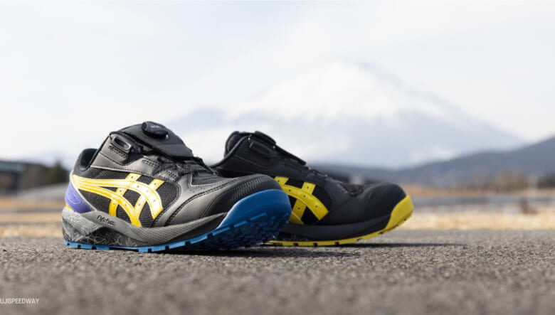 レーシングカラーを纏ったアシックスのワーキングシューズは、さりげないアシンメトリーカラーがソソる!