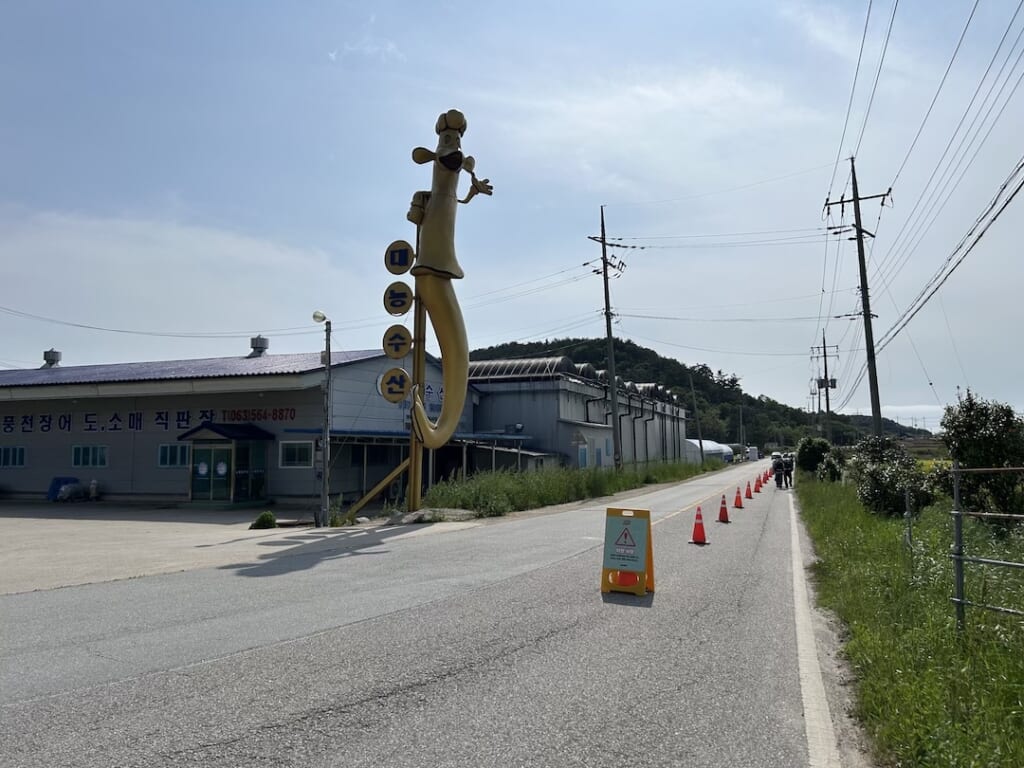 うなぎが名産であるゴチャン。道沿いには金色に輝くうなぎのオブジェも。そしてようやく1日目のゴール! みなさん疲れ知らずに飛び上がって撮影をしていました。