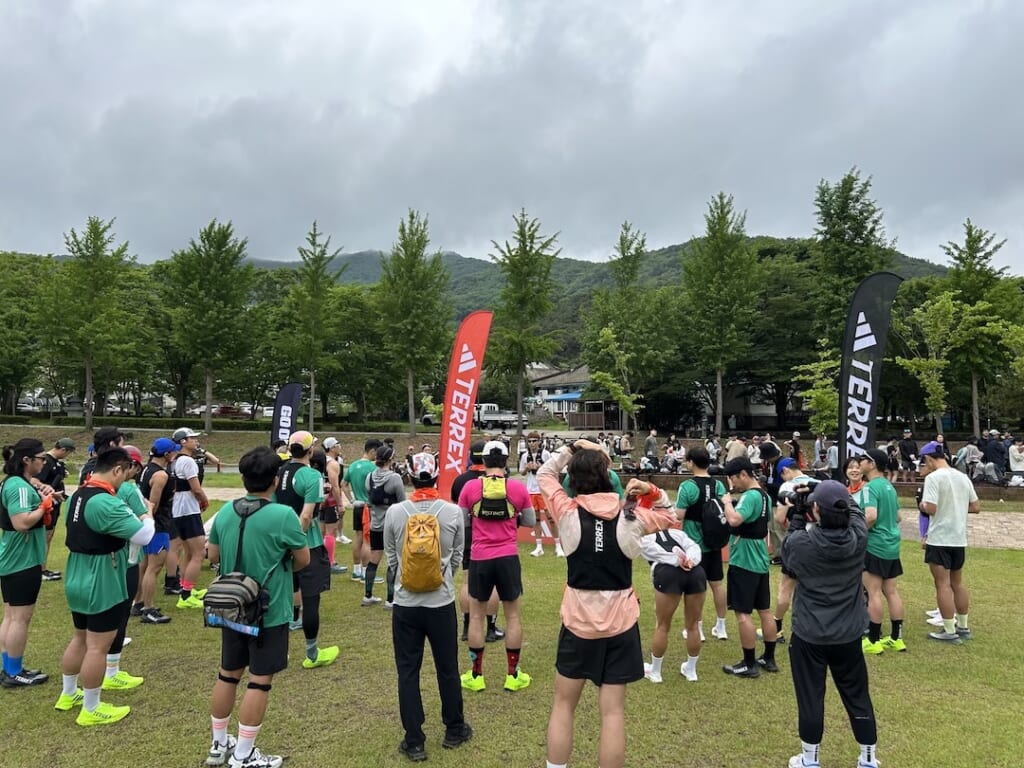 今回、特別プログラムとして100名のトレイルランナーが先にスタート。こちらに参加の方の荷物は車でゴールまで運んでもらえるので、皆さん完全ランニングスタイルで準備。