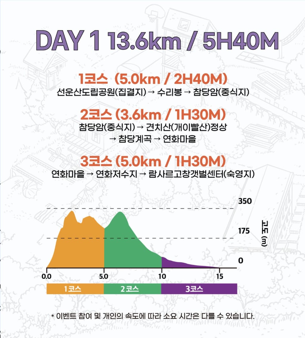 こちらは事前に配布されたパンフレットに掲載されたMAP。1日目は13.6kmの距離を最大5時間40分で歩く予定。1km15分で換算してみて、もしかして楽勝なんじゃない?なんて思っていました。ただ、この時MAPに掲載されている高低差は見逃していました。
