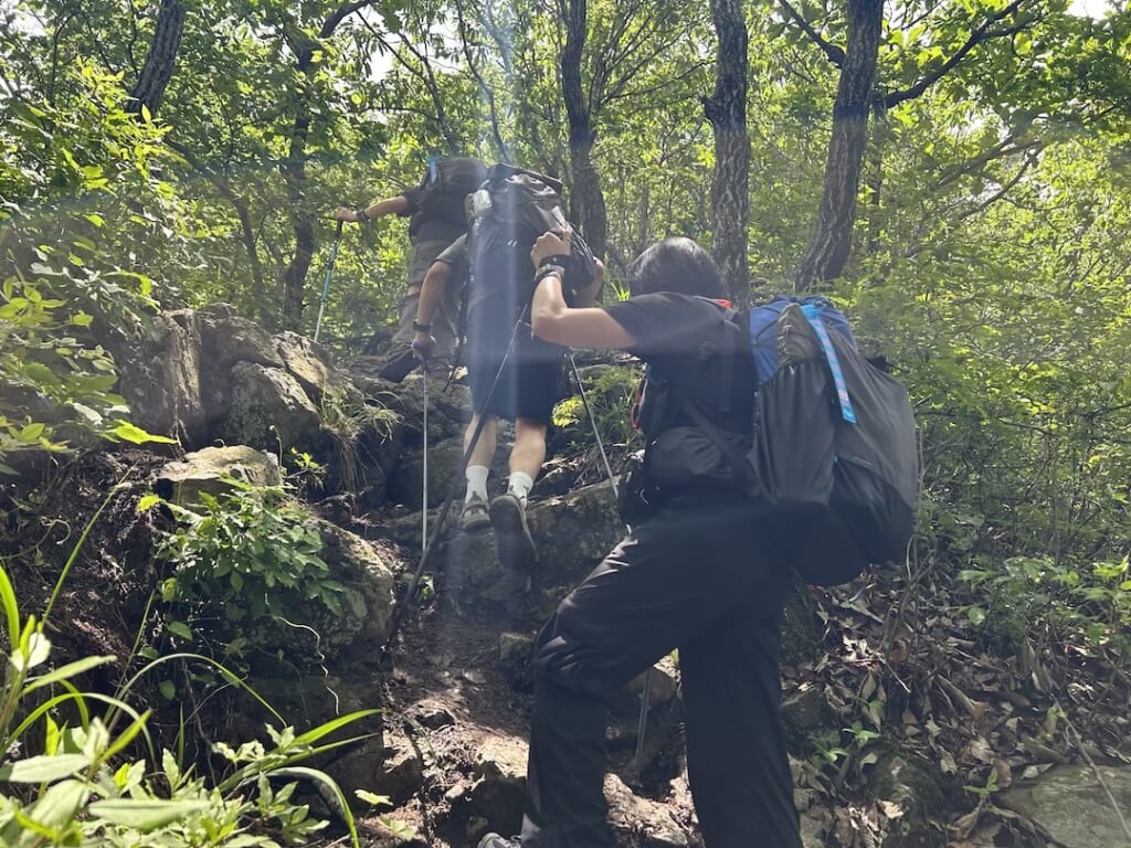 山に入った途端に急勾配を上がって行きます。しかも、しばらくずっと。これじゃSUPER CLIMBINGでしょ!と言いたくなるような道ばかり。とはいえ韓国ガイズはタフです。みんなスイスイ登って行ってました。しかも前夜は大雨だったので道は水浸しで岩が滑る滑る。トレッキングポールを持っていないと危なかったです。