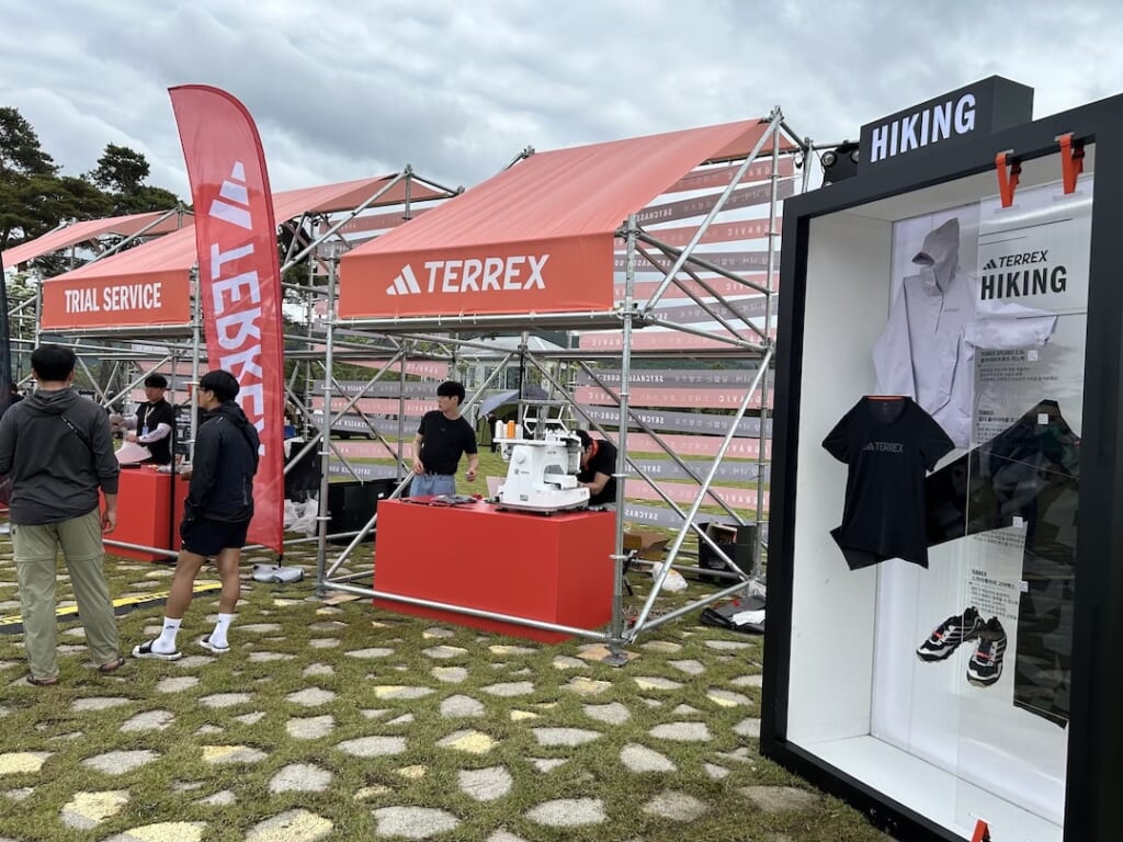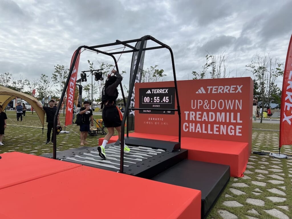 会場内ではアディダステレックスが刺繍ワークショップができるブースなどを展開。一番目を引いたのがトレランシミュレーター。