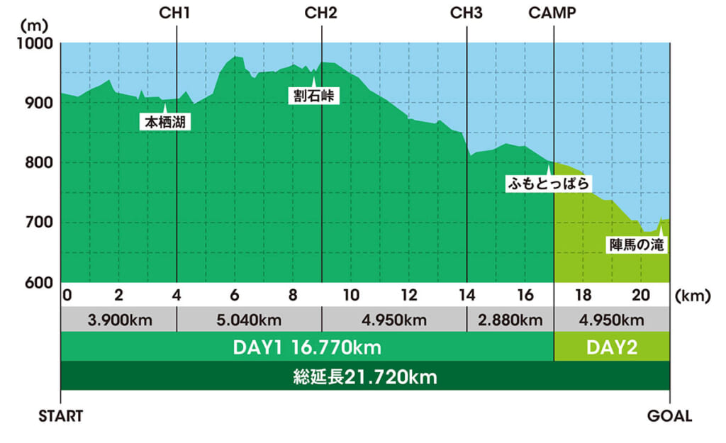 夜は各自テント泊。キャンプギアは自分でバックパックに入れて運ぶ必要があるが、キャンプ地に直接ギアが届く「hinataレンタル」の利用もできるので、体力に自信のない人やキャンプ装備に不安がある人も安心だ。