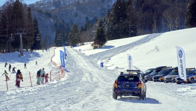 今回の主役となったのは、「ストロングハイブリッド」を搭載した「クロストレック S:HEV」。2.5L水平対向エンジンに2つのモーターを組み合わせた、モーターだけでも走行できるシリーズ・パラレル式ハイブリッドで、モーターの最大出力は約120馬力!! 発進時にスムーズにパワーを路面に伝える加速で、ゲレンデの雪上でもその威力をいかんなく発揮していました。
