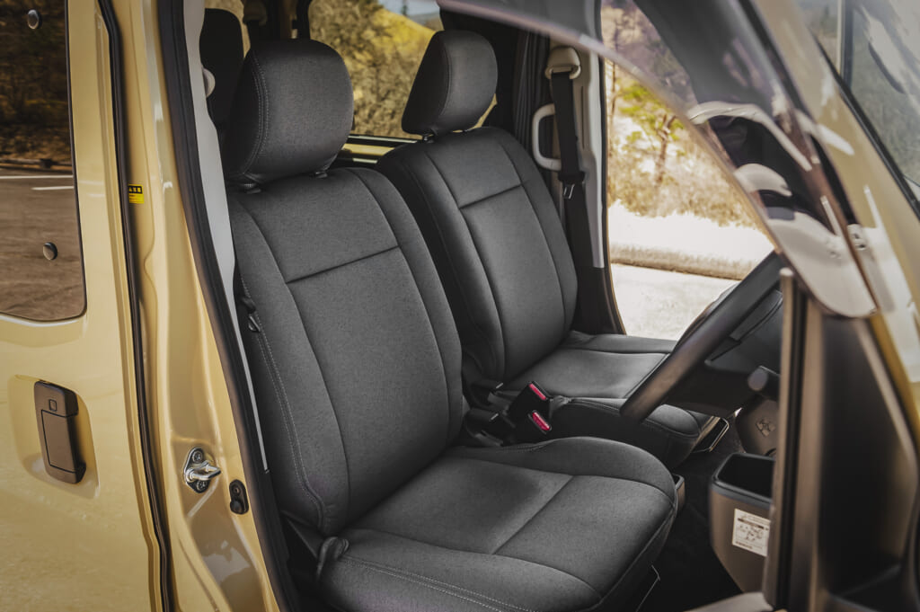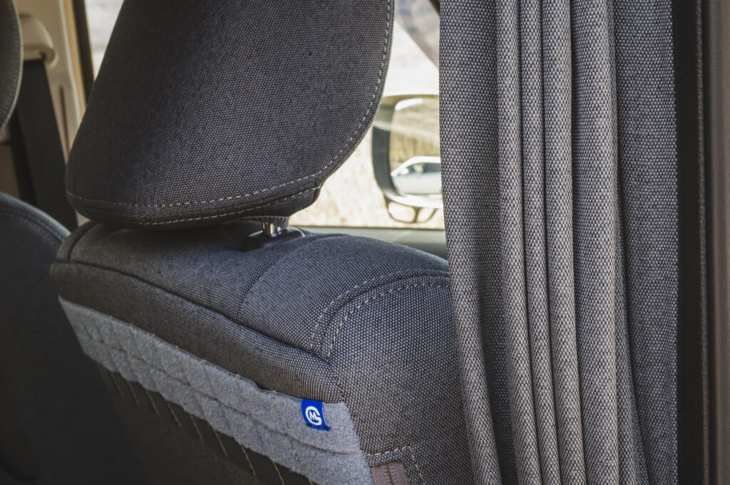 シートカバーは先述したカーテンと同様のグレーで統一。中央部分にスポンジを使ってクッション性を高め、快適な乗り心地を実現している。