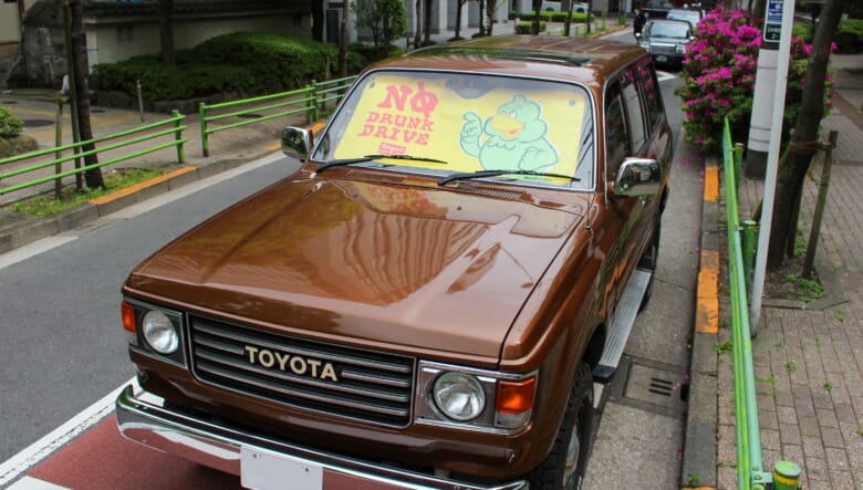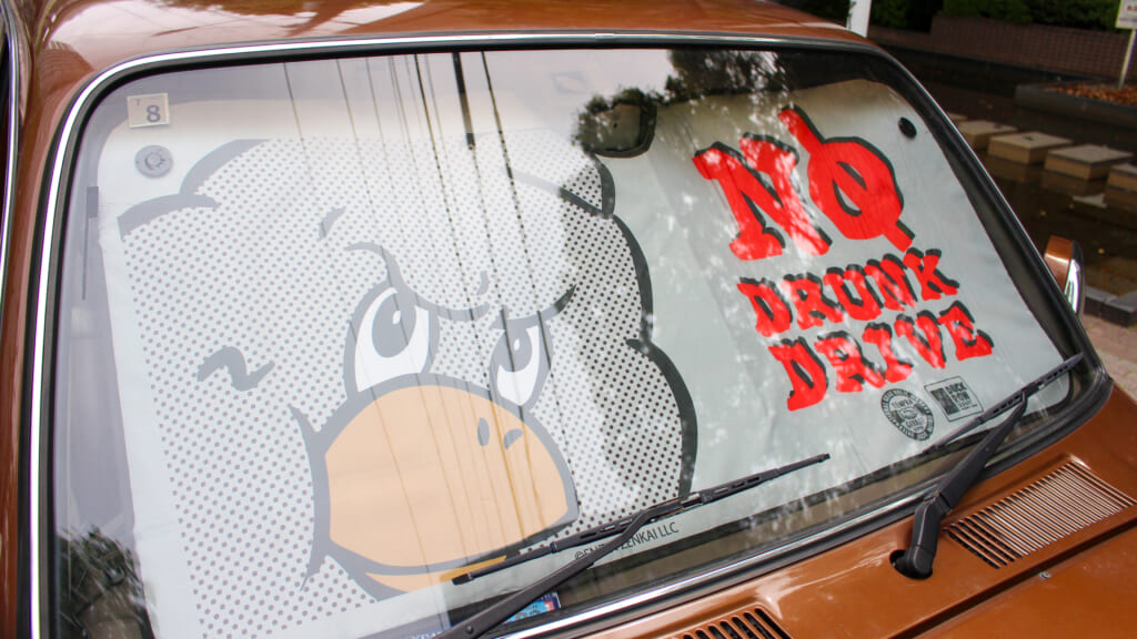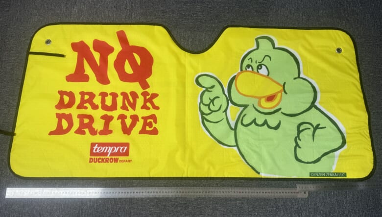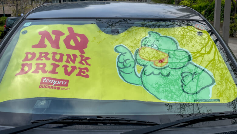じつはダックローは八咫烏(やたがらす)がモチーフで太陽の化身ともされている。そんなキャラがギンギンに照り付ける日光から愛車を守り、ついでに飲酒運転の注意喚起をしてくれるのが微笑ましいのだ!