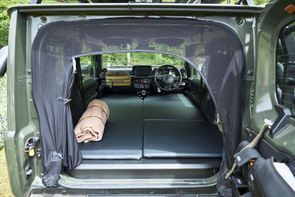 サイドに取り付けたスタックリカバリーラダーが物語るように、野営好きというオーナーのサイト。趣味が色濃く反映された車中泊仕様のジムニーは、よく見るといたるトコロに便利な機能をプラスしていた。