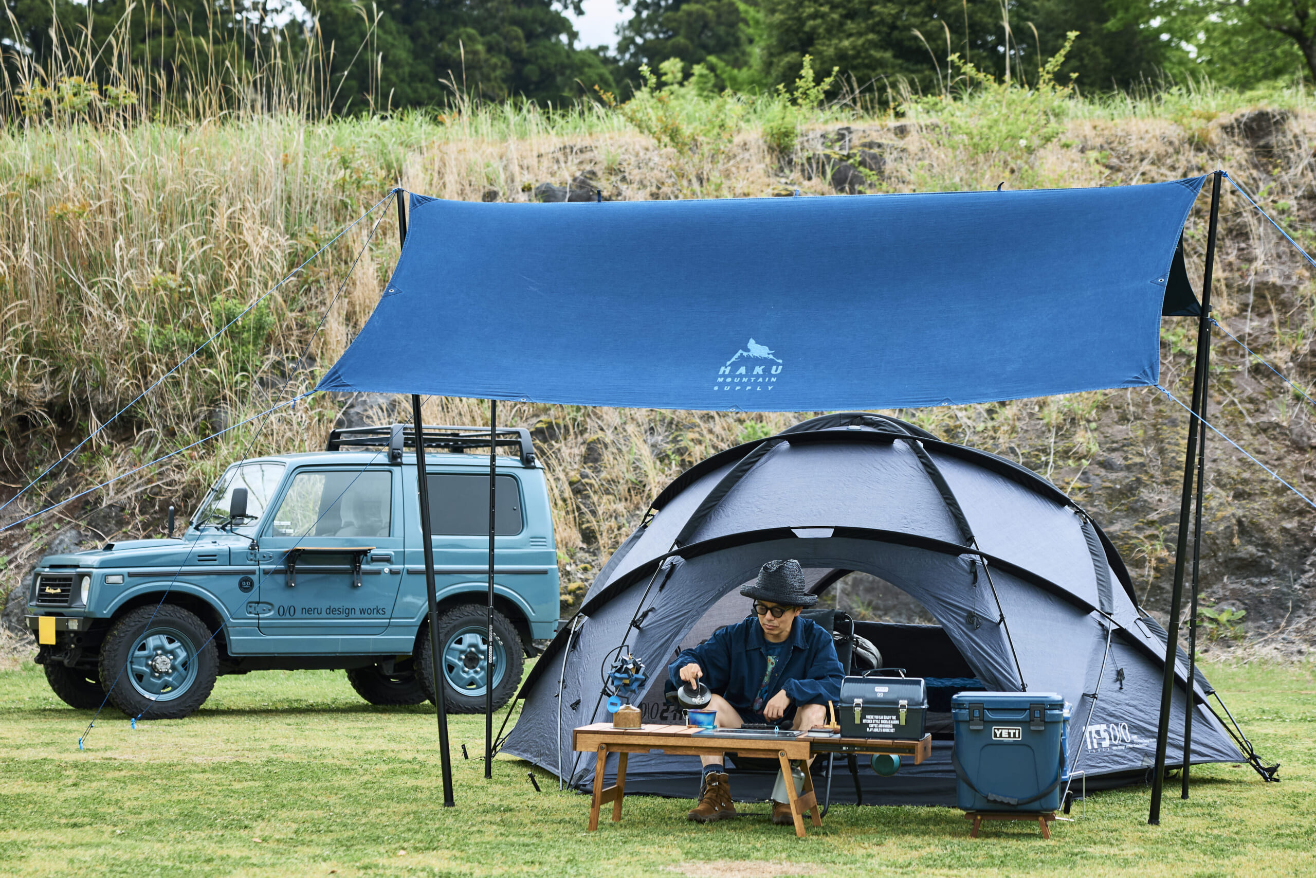 コットンに撥水加工を施したハクマウンテンワークスのタープも、もちろん色味でセレクトしたものだが、ブルーのガイラインをネットで購入して付け替えるほどの徹底ぶり。愛車も含めたトータルコーディネートのセンス抜群!