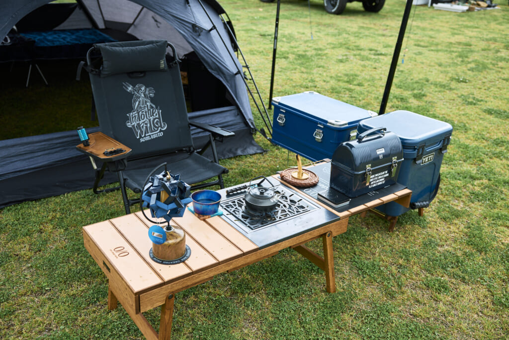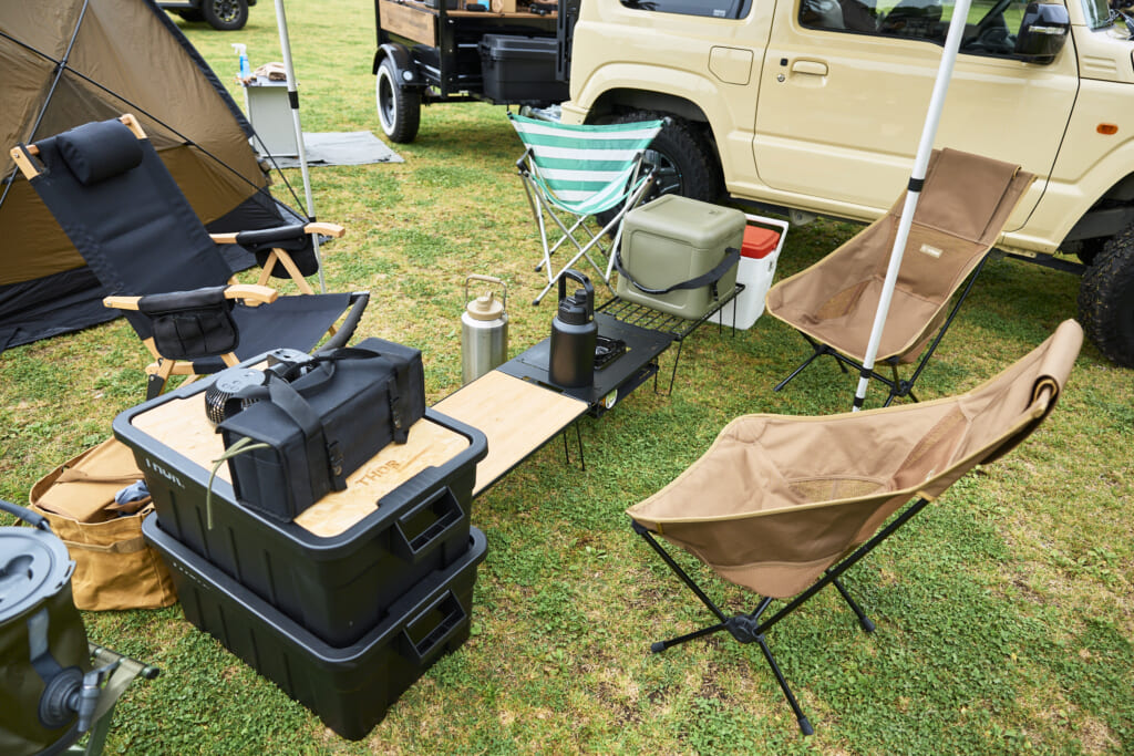 車体のベージュに似合うヘリノックスのチェアや、ポモリのドームテントで色味を統一。手前のジャグは折り畳み式のコラプズを選び、テーブルはネットで購入したメッシュラックに天板を取り付けるなど、軽量化を意識したセレクトに。