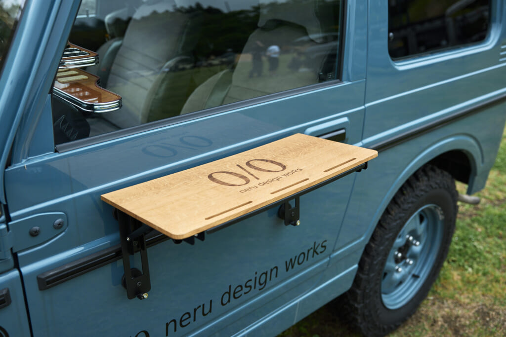 クルマのサイドには、ネルデザインワークスのサイドテーブルを。強力なマグネットを4つ備え、簡単に着脱できる。