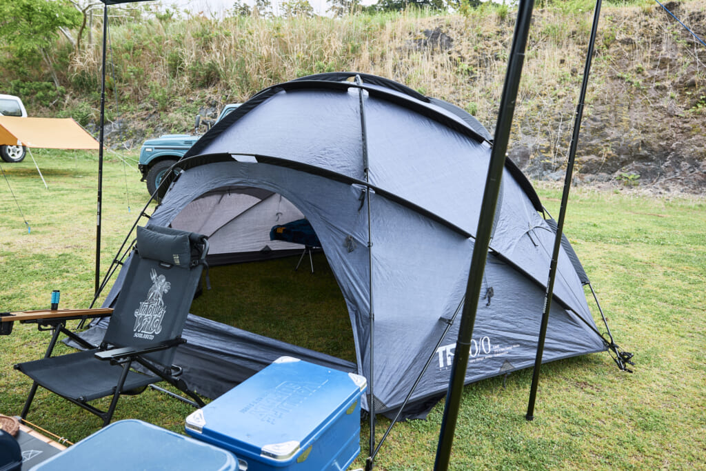 テントサイトからもわかるように、ネイビー好きのヤナイさん。静岡の専門店MSテックとネルデザインワークスがタッグを組んだ通称「ネルジムニー」も、ブルーグレーをチョイスするほど。ドームテントはネルデザインワークスのケイブだが、こちらはダイニーマ素材を使ったレアモデル。