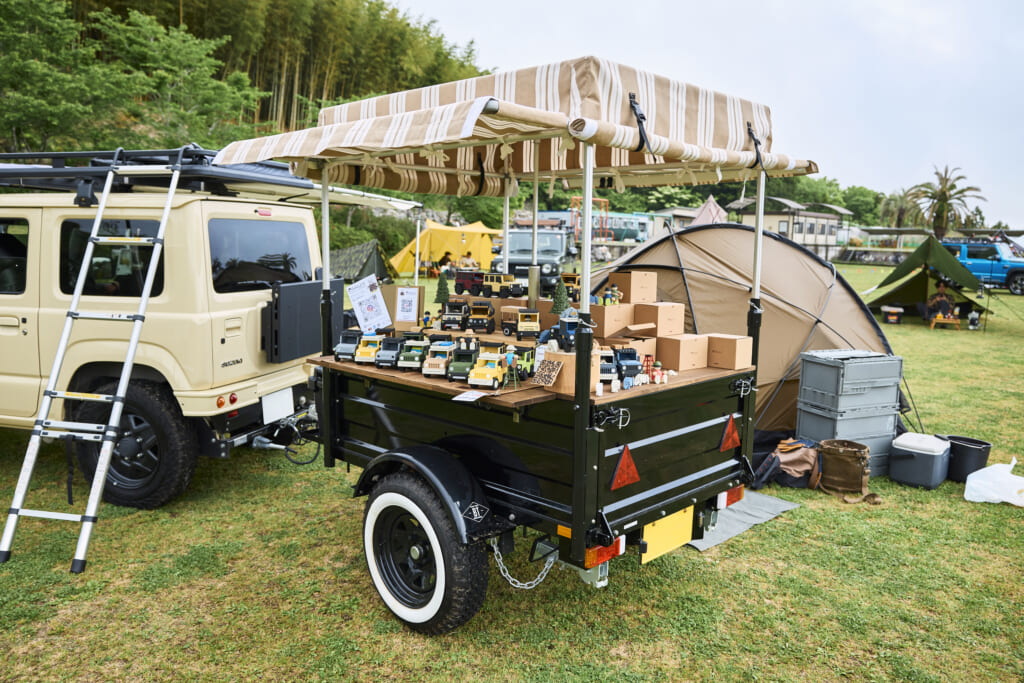 牽引するトレーラーはブラストトレイルで特注したモデル。今回はジムニーのオブジェを展示しているが、今後はコーヒーショップを展開予定とか。