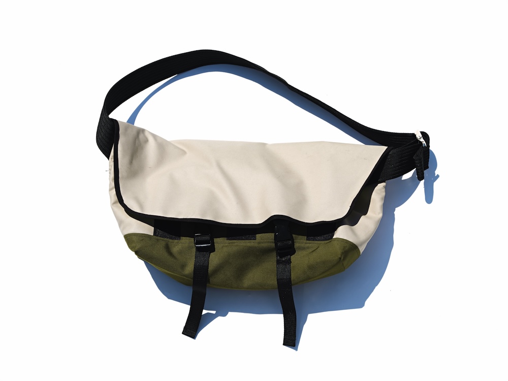 ハンドメイドのメッセンジャーバッグは、以前に作ったものがちょっと大き過ぎたために、コンパクトなサイズで制作。フラップ内にあるポケットはマチ付きなので、厚手のアイテムも収納が可能だそう。