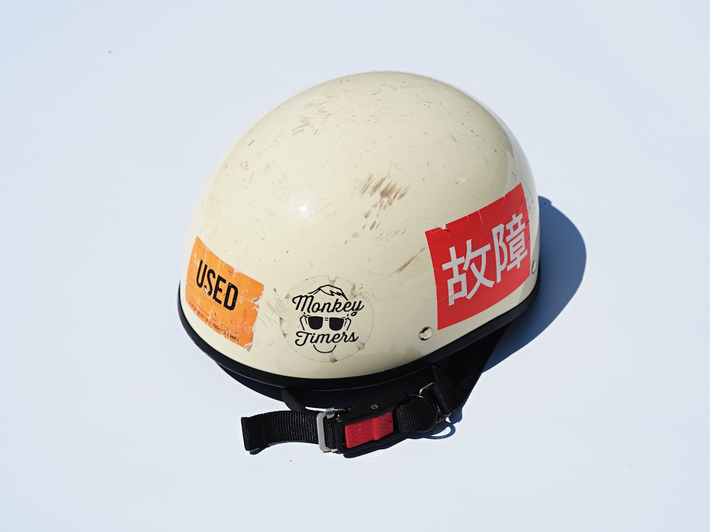 バイクと同時に購入したヘルメットは、友人にもらったデカールや先輩の音楽ユニットであるモンキータイマーズのステッカーでチューンナップ。