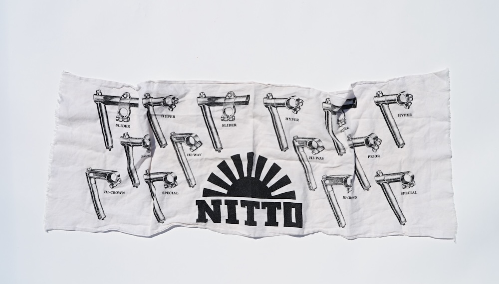 あると便利な手ぬぐいは、自転車パーツメーカーであるNITTOのステムが描かれたもの。「何種類か持っていたんですが、破れてしまったり無くしてしまって、残っているのはこれだけです」。