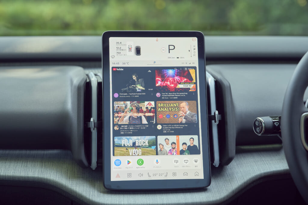 センターディスプレイの上部にスピード、ギアポジションなどのメーターパネルの要素を表示し、Googleマップなどのアプリ、エアコンに加え、ハザード、サイドミラー、グローブボックスの操作まで可能。停車時はYouTubeを視聴できるのもグッド!