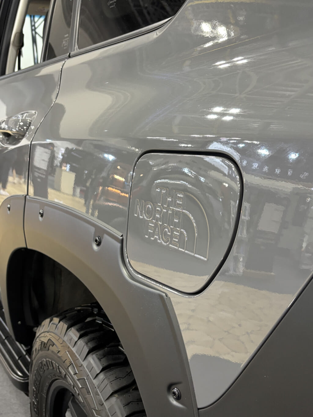 と、難しいことはさておき、見た目だけでソソられるのがグラファイトグレーと呼ばれるカラーリング。聞くと、ザ・ノース・フェイスが誇るデナリジャケットからインスピレーションされたカラーとのことでファンには堪らないこだわりも。給油口カバーにはエンボス風のロゴが施されていました。