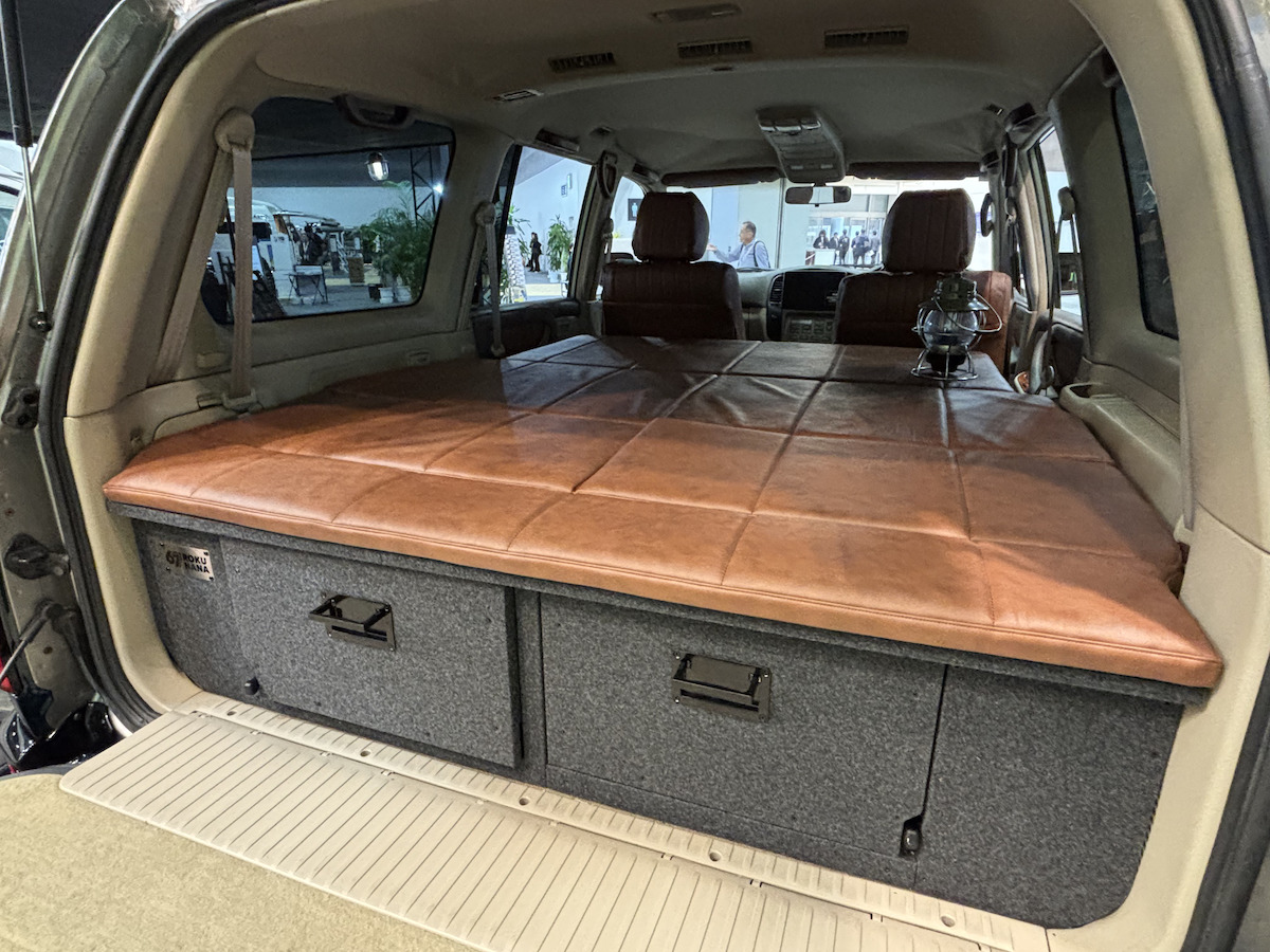 後ろから覗くとベッドになっているし、言う事なし! FLEXの「67 ROKU NANA ドロワーキット」にシート同色のレザー製ベッドマットで超フラットな空間に。収納力もあって寝心地バツグン(きっと)。これでキャンプや釣りに行ったらさぞ鼻高々で快適なことでしょう。