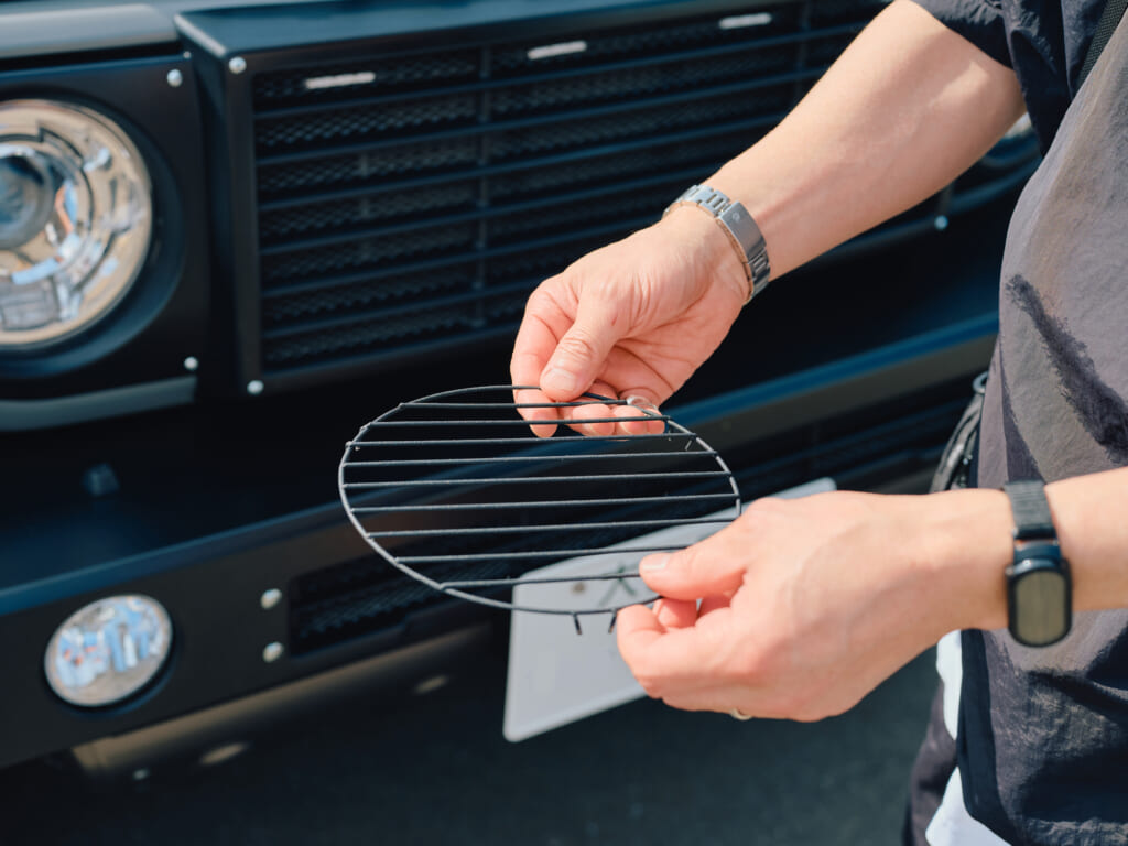 サイドステップやフェンダーはダムドで、レトロフェイスなグリルはKLCのものをセレクト。純正バンパーにラプター塗装を施し、さりげなくイメージチェンジ。また後部座席の窓にはサイドパネルのほか、好きなブランドなどのステッカーでチューンナップ。ファッション的エッセンスもプラスした。