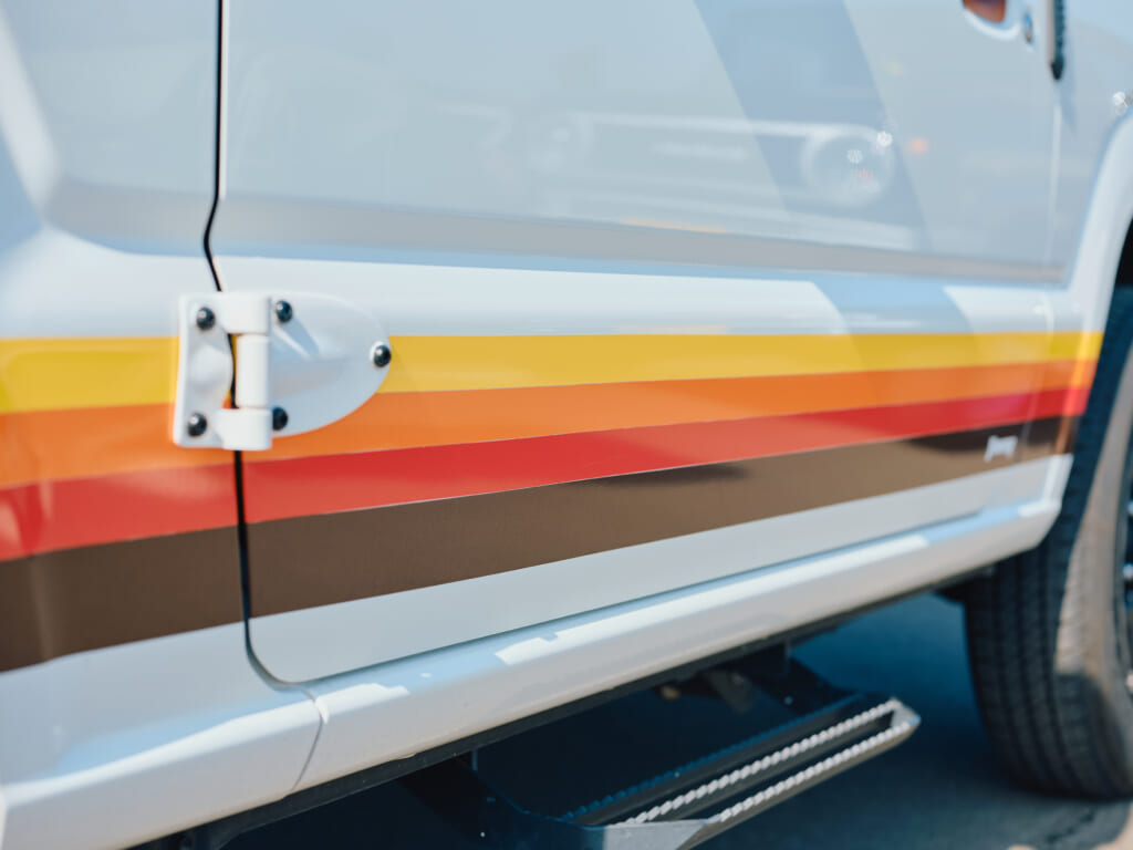 前後バンパーにダムドの「ザ・ルーツ」を装着し、サイドデカールはDIYでカッティングシートを切り貼りした。レトロさもありつつ、スタイリッシュなルックスに。CLリンクのフロントグリルとフォグランプでアウトドア味をアップした。