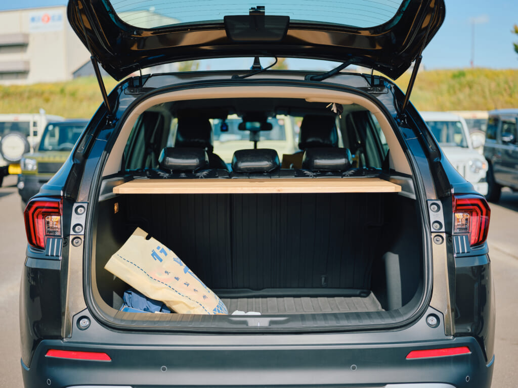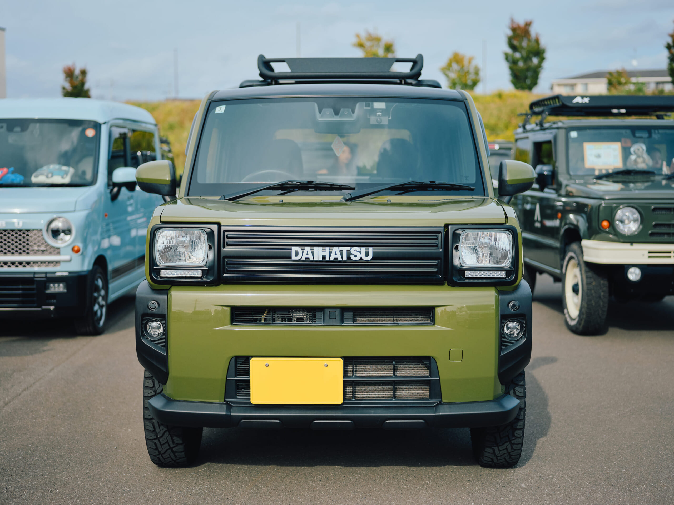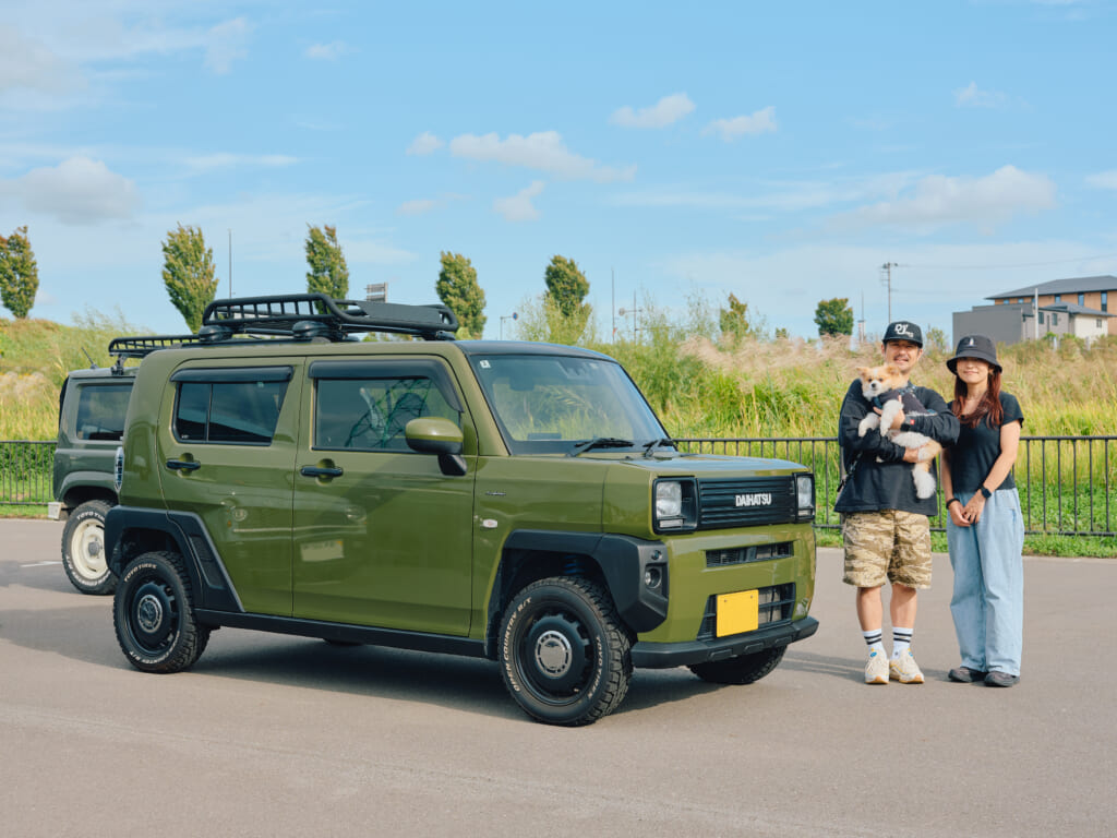 ヤングタイマーなボディキットの「ラッキー」に惚れ込み、タフトを選んだご夫婦。シルバーのパーツをすべてブラックに塗装したほか、ラギッドなデザインのルーフラックをセレクト。角張ったデザインのほか、電気系統も標準のまま使用できる仕様など、使い勝手の良さもお気に入りのポイント。