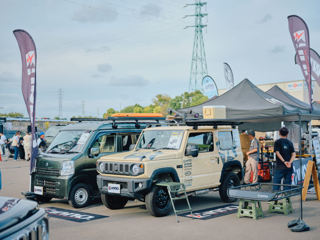 アウトドア派必見のカーアクセサリーブランド、イノーのブースでは、新作のルーフカーゴキャリアを展示。トーヨータイヤのブースでは、軽対応サイズとなるオープンカントリーH/T Ⅱのホワイトレターモデルが初披露!