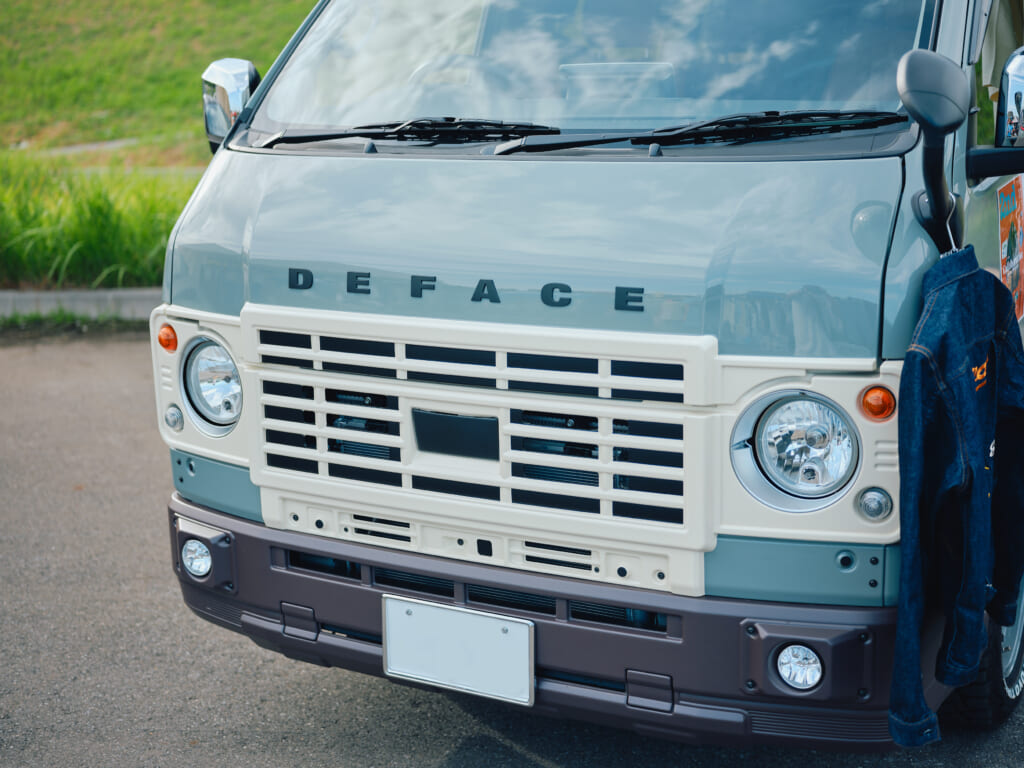 この日、はるばる岡山から出店していたグラフゼロチームは、リトルDをモチーフにした旧型ディフェンダー風味のフェイスが特徴の「デフエース」で登場。アーバンカーキのボディも相まってレトロな雰囲気に。アメカジをベースにしたモノづくりを展開するブランドにぴったりの世界観!