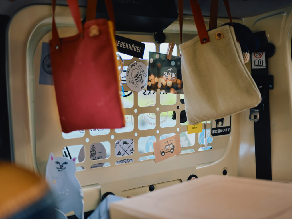 昭和ガレージのルーフキャリアなど前オーナーのカスタムをそのまま引き継ぎつつ、顔まわりはすべてダムドの「リトルD」パッケージのパーツを揃え、自ら取り付け。またマットフラップはゴムマットをカットし取り付けているほか、ダミーヒンジは自ら塗装するなどDIYを駆使したカスタムにも注目。