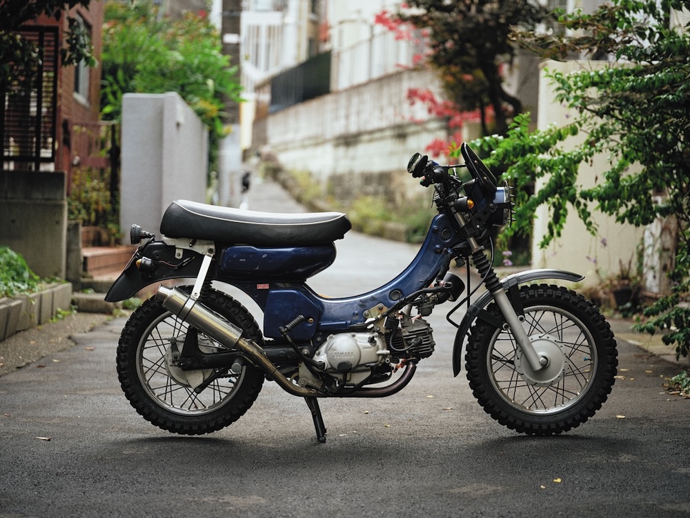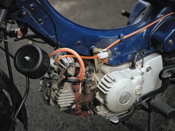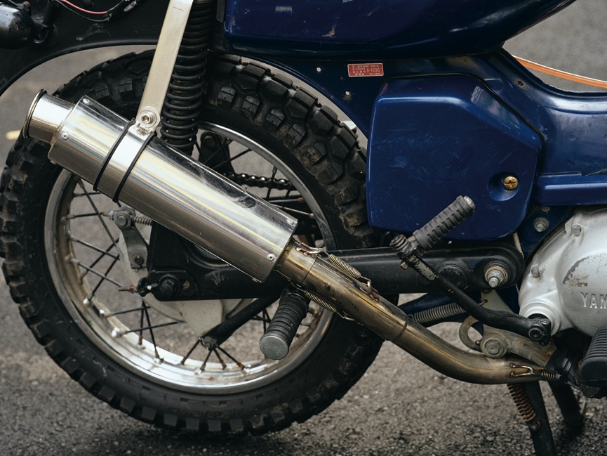2008年まで生産されていたヤマハのビジネスバイク。乗降しやすいアンダーボーンフレームに郵政仕様車ベースのため、前後にカゴやケースを装着しやすい14インチタイヤを採用。栗原さんの愛車は最終型のT90モデル。
