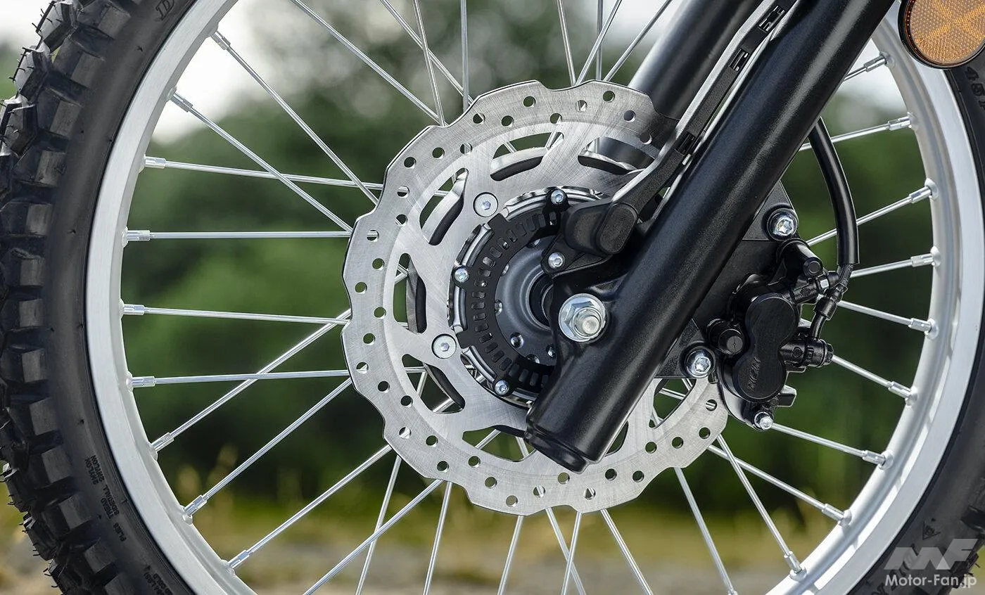 制動系には前後ディスクブレーキを採用し、フロントにはABSを標準装備した。フロントは267mm径ディスクと2ポットキャリパー、リアは220mm径ディスクとシングルポットキャリパーの組み合わせで、オフロードからオンロードまで幅広いシーンでコントロール性に優れた制動力を発揮する。