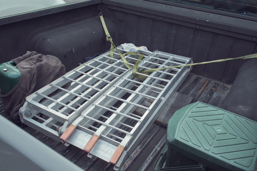 フォトグラファーの望月さんが乗るダットサン トラックは、ダブルキャブのMT車というこだわりのチョイス。オーバーフェンダーを外したあえてのナローカスタムにハイエース純正の15インチホイールを装着し、オープンカントリー M/T(30×9.5R15)を合わせる。左右でホワイトレターとブラックレターを履き替えるこだわりにも注目。バイクも趣味ということで、荷台にはラダーも常備する。