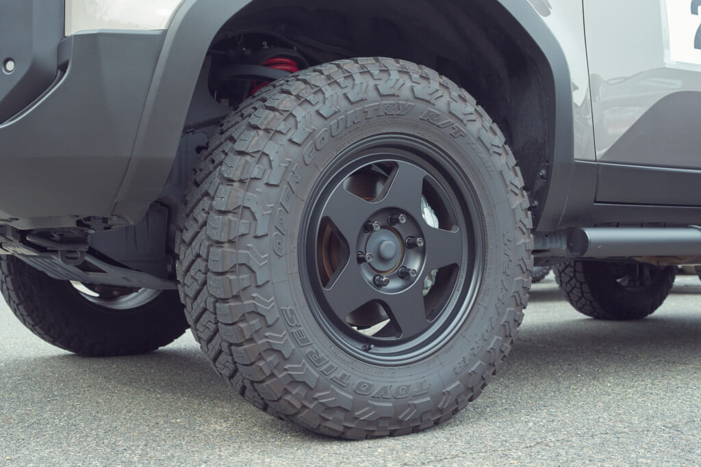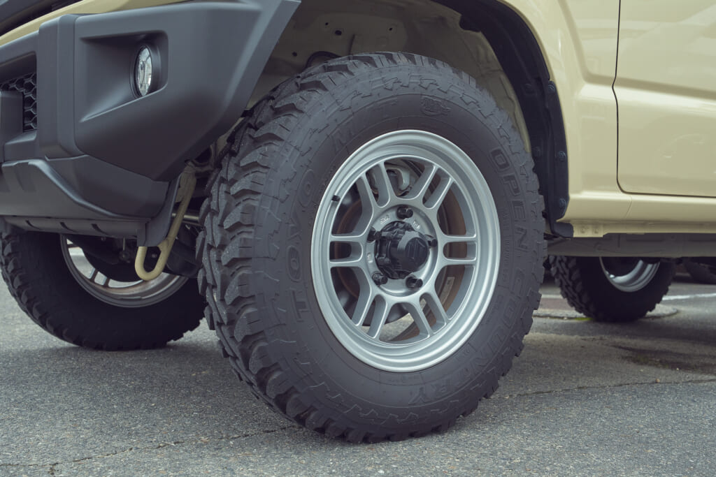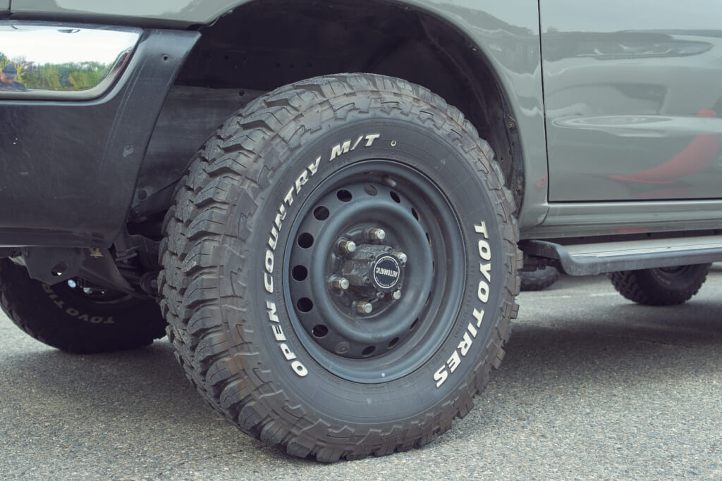 シリーズ最高の悪路走破性を誇るオープンカントリーM/T Rのひと回り大きいサイズ(195R16)を履くべく、1インチアップしたENKEIのホイールを装着。タイヤのサイドウォールに入るATTACK THE DIRTの刻印もお気に入り。車内のクォーターウインドウガラスに取り付けたIPFのラック、ヘリノックスのポーチなどアウトドアスタイルな車内の仕上げもグッド!