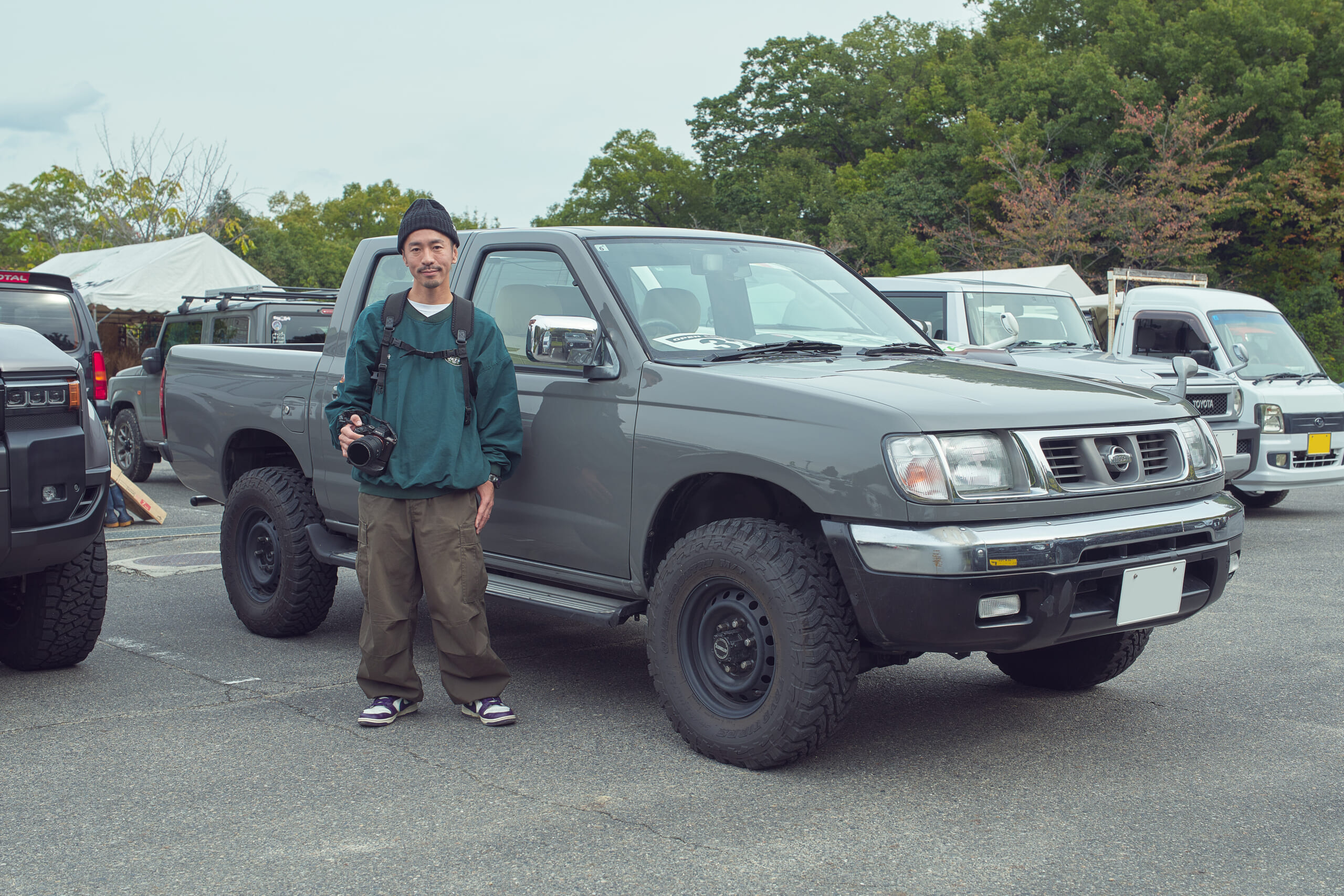 フォトグラファーの望月さんが乗るダットサン トラックは、ダブルキャブのMT車というこだわりのチョイス。オーバーフェンダーを外したあえてのナローカスタムにハイエース純正の15インチホイールを装着し、オープンカントリー M/T(30×9.5R15)を合わせる。左右でホワイトレターとブラックレターを履き替えるこだわりにも注目。バイクも趣味ということで、荷台にはラダーも常備する。