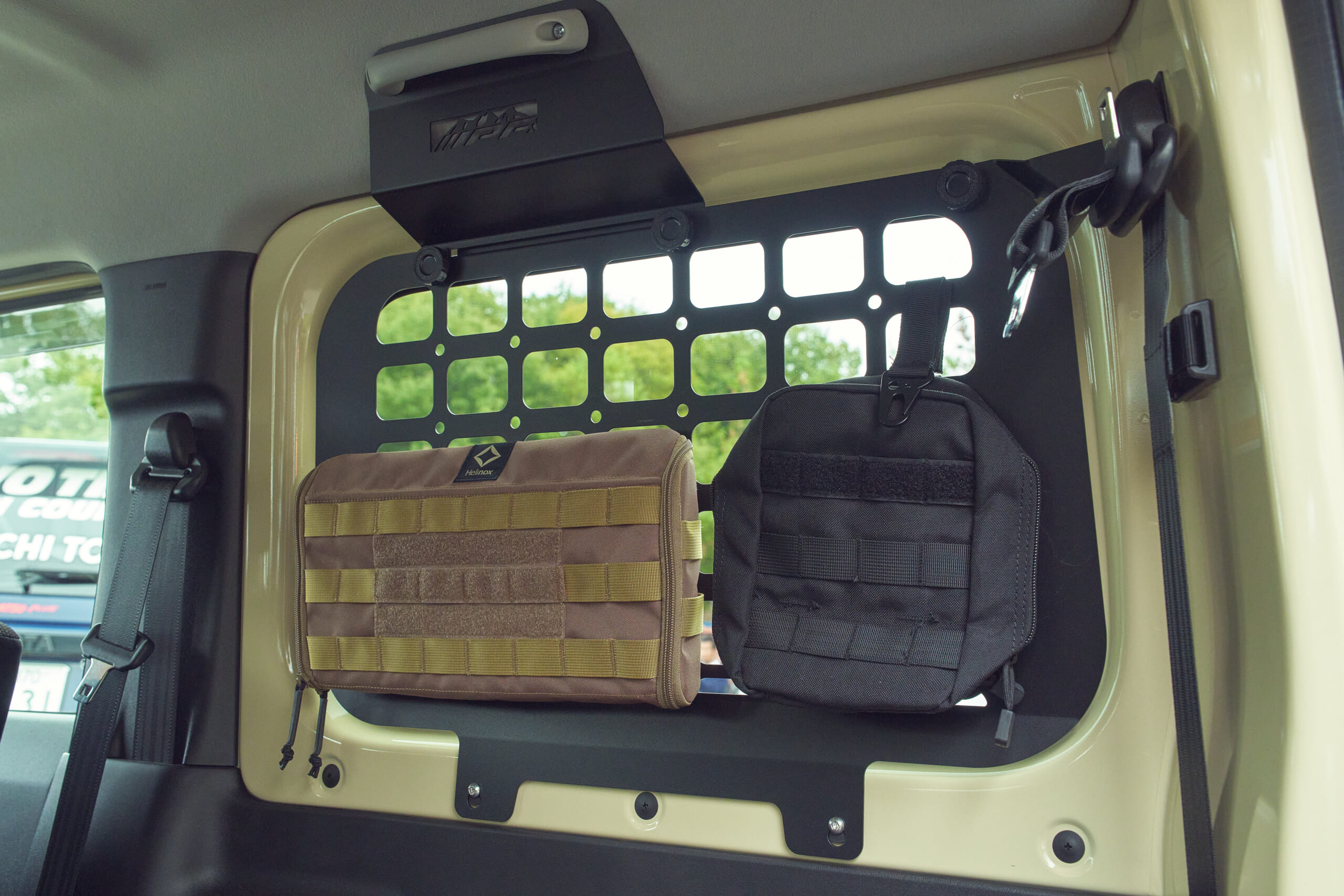 シリーズ最高の悪路走破性を誇るオープンカントリーM/T Rのひと回り大きいサイズ(195R16)を履くべく、1インチアップしたENKEIのホイールを装着。タイヤのサイドウォールに入るATTACK THE DIRTの刻印もお気に入り。車内のクォーターウインドウガラスに取り付けたIPFのラック、ヘリノックスのポーチなどアウトドアスタイルな車内の仕上げもグッド!
