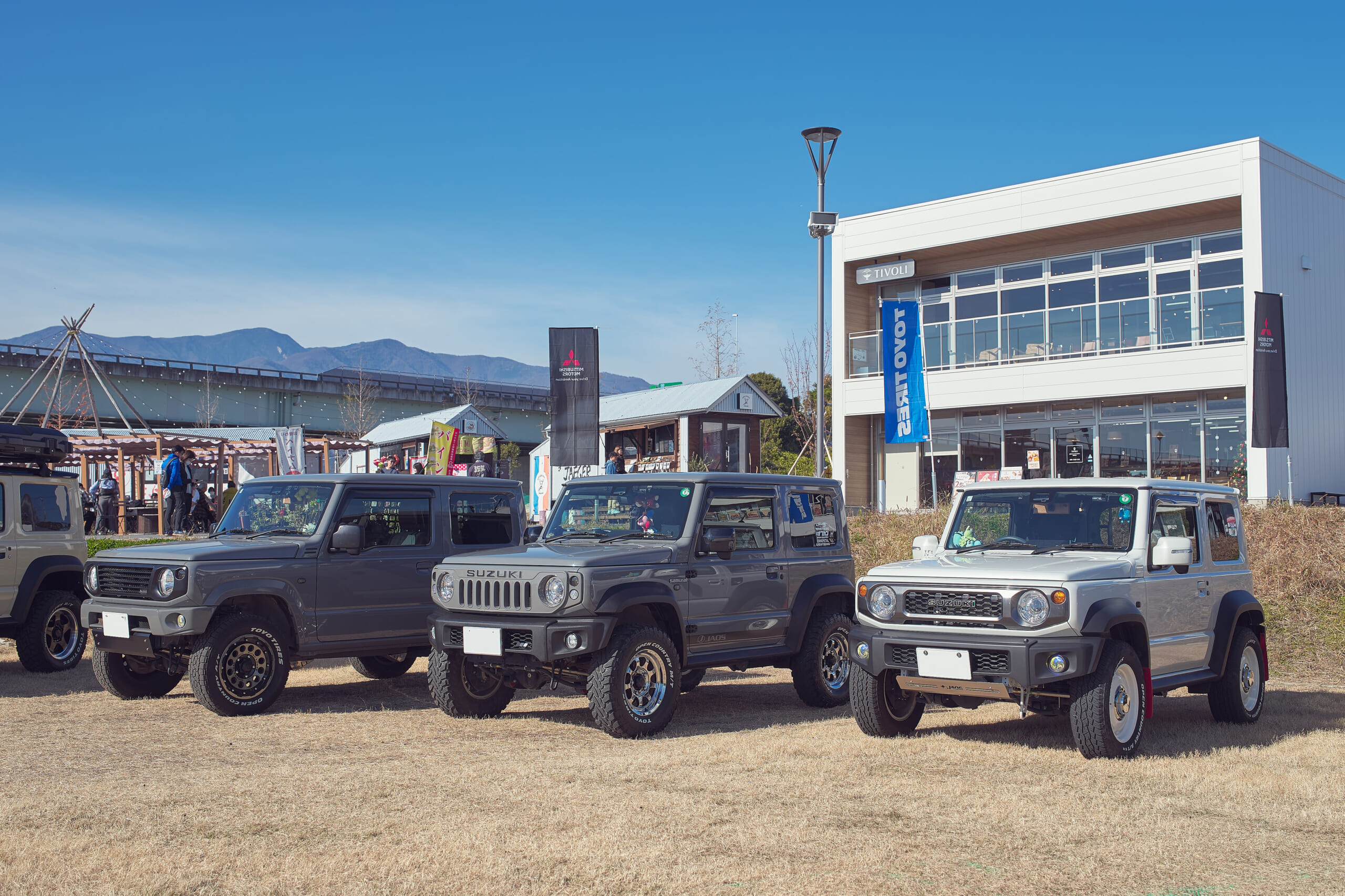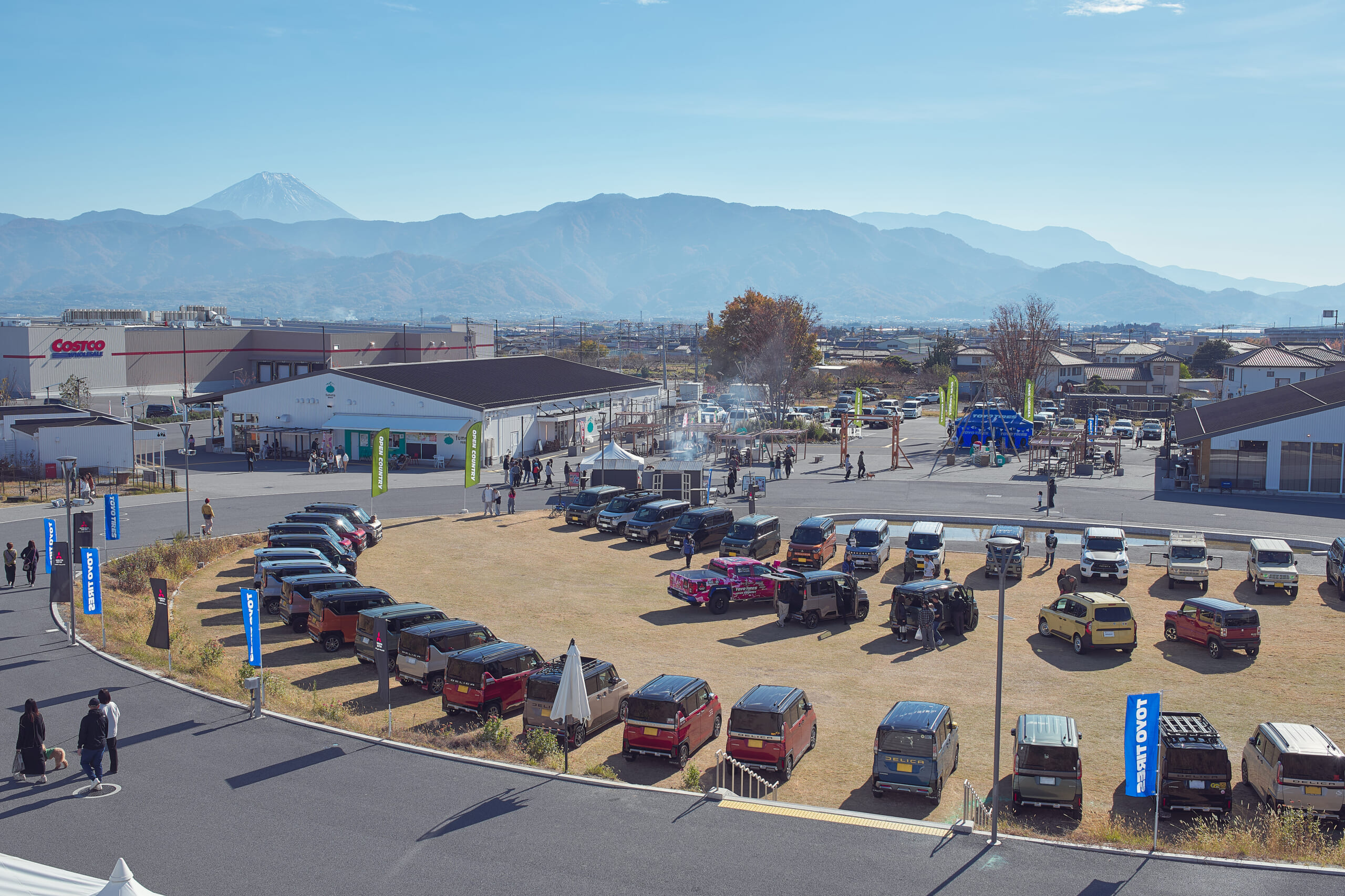 会場となったのは、山梨・南アルプス市に位置する体験型複合施設のfumotto(フモット)南アルプス。隣はコストコがある商業エリアで、地域交流エリアとなるフモットは飲食店や農産物直販所などがある南アルプス市のランドマークとして昨年オープンした場所。富士山を望めるロケーションのイベント広場には、デリカミニがずらり整列。その列にオープンカントリー装着車も続いて、参加者の愛車が扇状に並ぶ様子はお見事!
