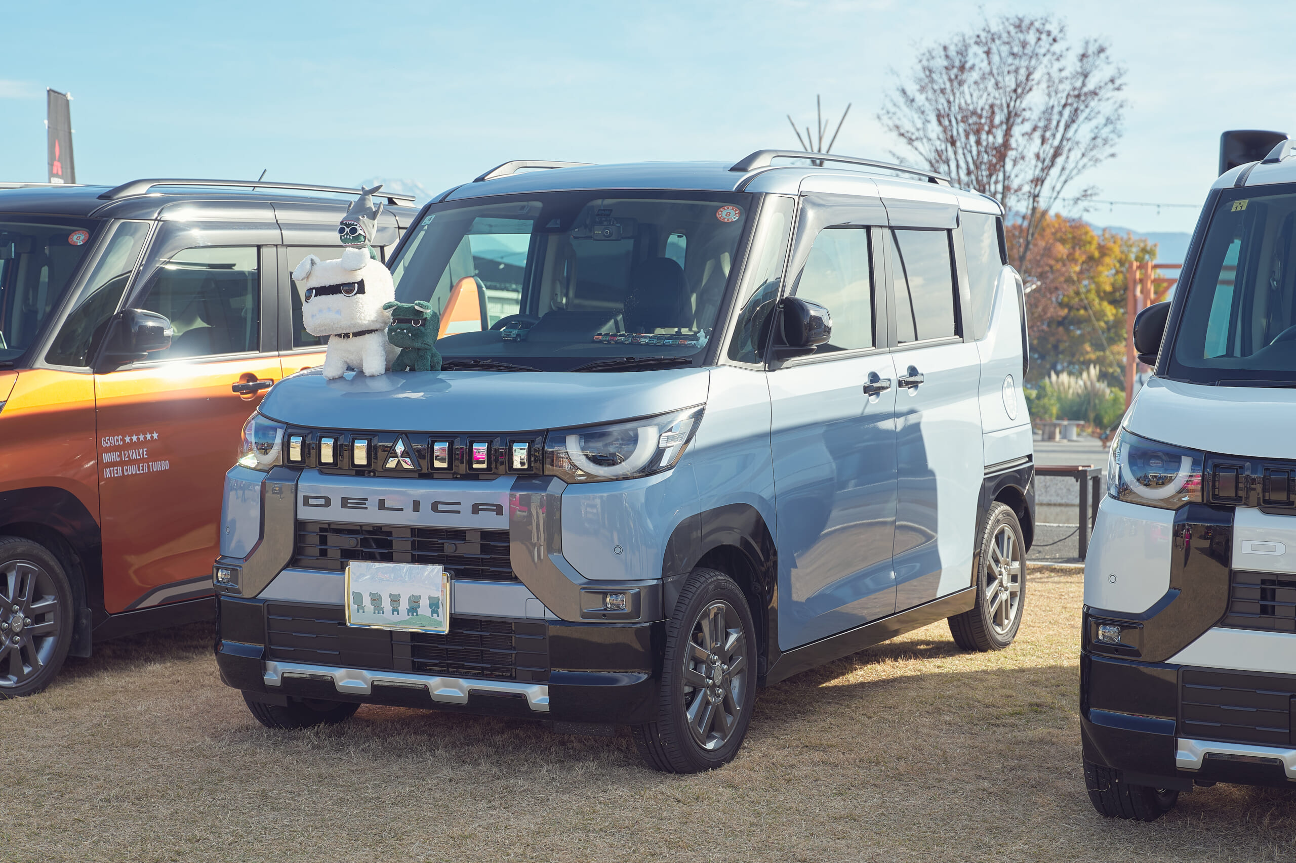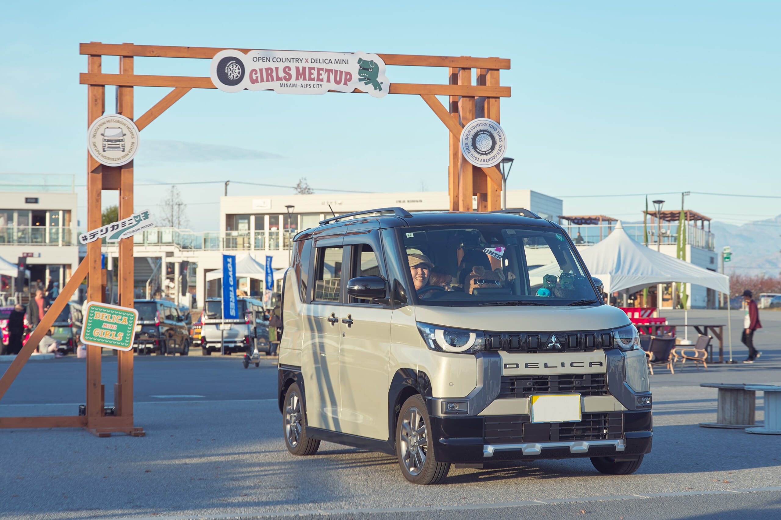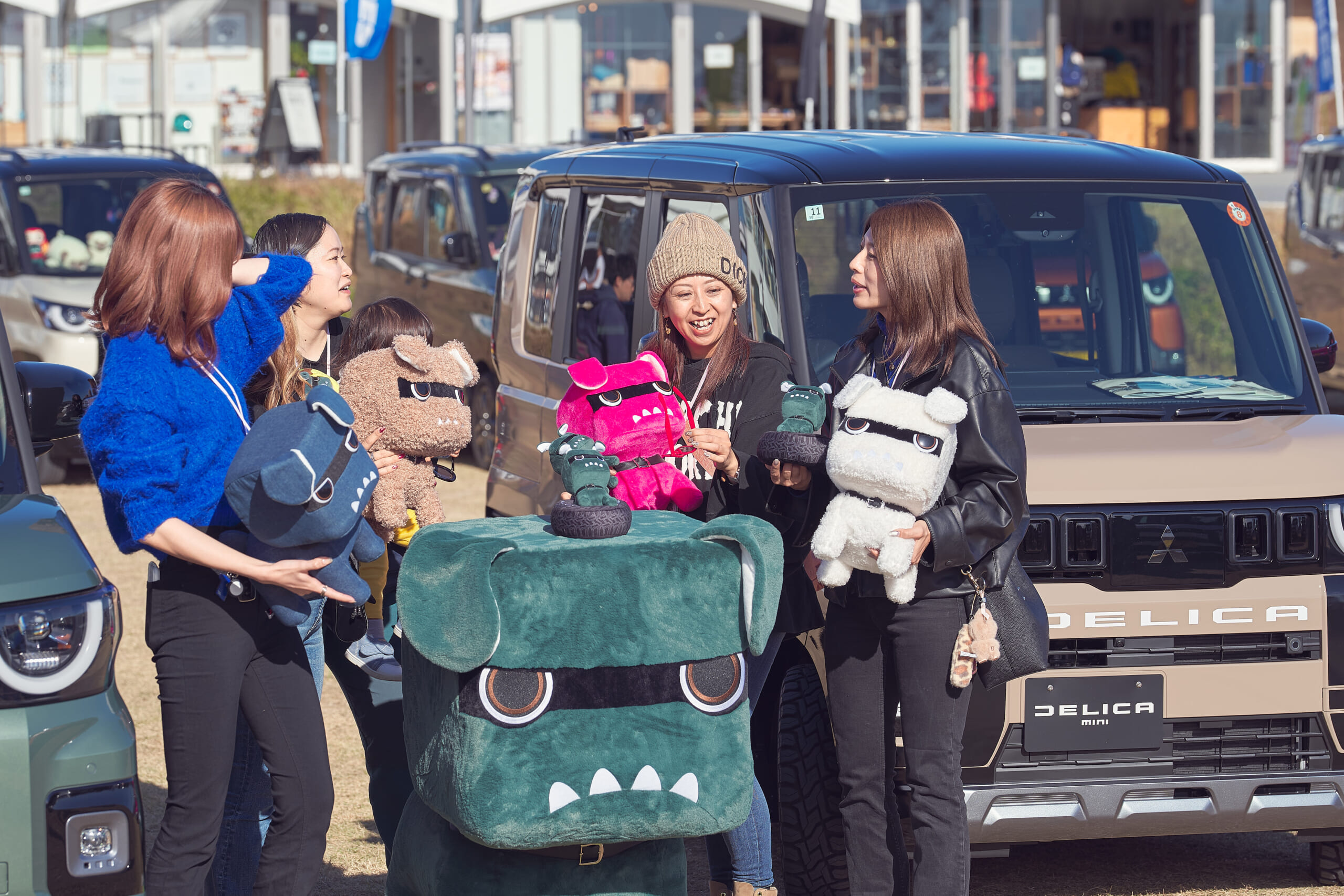 会場には、デリカミニのイメージキャラクターとしてご当地デリ丸。までラインナップするほど人気を集めているデリ丸。の各種ぬいぐるみと共に新型デリカミニが登場し、チャラン・ポ・ランタンのももさんが愛車とするカングー(はろり号)、オープンカントリー H/Tを装着した#オプカンペットのデモカー(#オプカンGOO)のほか、参加者の新旧デリカミニ、ジムニー、ハスラーなどが並び、fumotto 南アルプスを訪れていた一般のお客さんからも注目を集めていた。