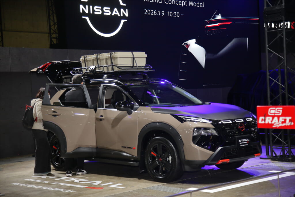 日産自動車ブースのお立ち台で一際輝いていた「X-TRAIL ROCK CREEK MULTIB」。車中泊を可能にしたマルチベッドシステムに興味津々の様子! ルーフキャリアや各種ガーニッシュを纏った「SOTOASOBIパッケージ」でギア感が高められている。