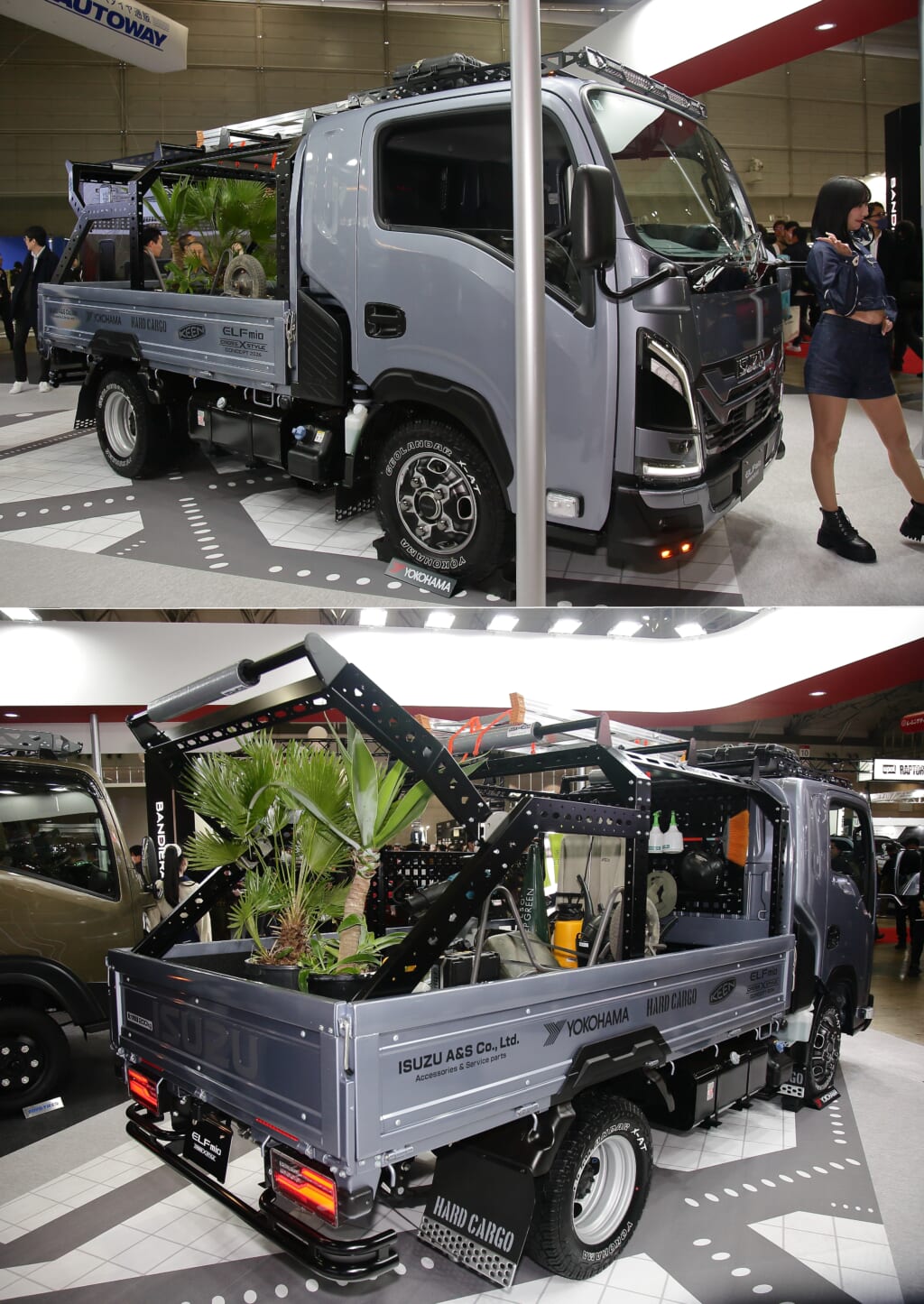 「ISUZU(いすゞ)」と言えばトラックが代名詞! こちらは普通自動車免許でも運転できる「エルフミオ スペースキャブ」をベースに大胆にカスタマイズした「CROSS STYLEコンセプト」。荷台にはハードカーゴ製の可動式ワークキャリアやユーティリティパネルを装備して、仕事から趣味まで様々な用途に対応させている。