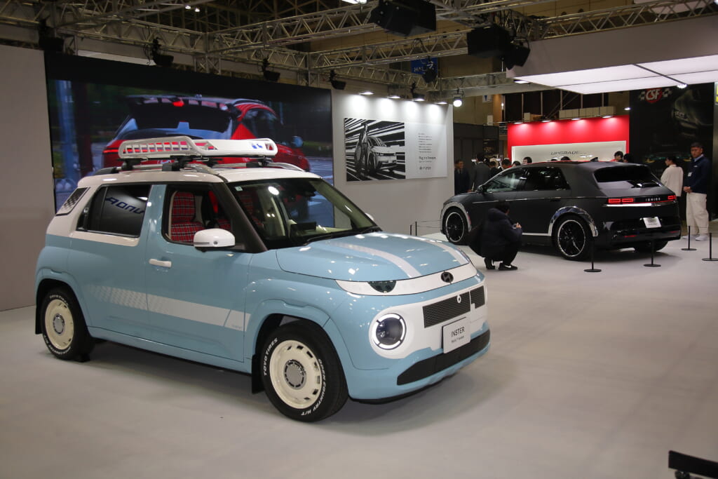 韓国の自動車メーカー「Hyundai(ヒョンデ)」ではスモールEVの「INSTER」をリゾート風にアレンジしたINSTER Retro Travelerがお目見え。写真奥に見えるのはフラッグシップのSUV「IONIQ 5」をロックミュージシャンのMIYAVI氏のサウンドに合わせてチューニングしたコンセプトモデルだ。