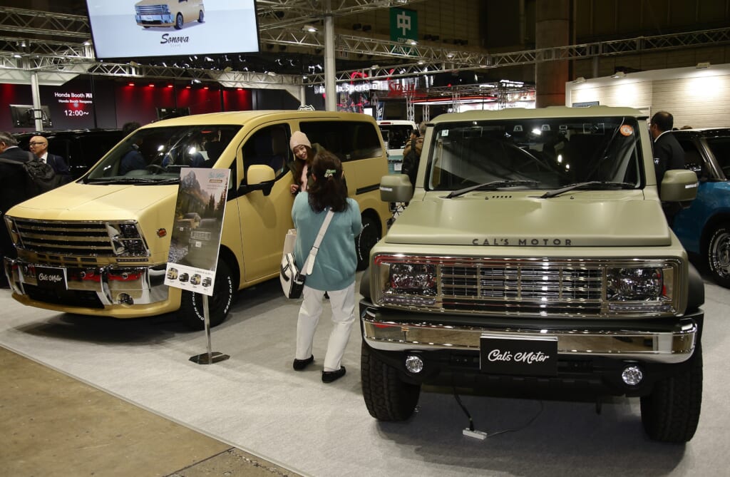 アルパインスタイルのオリジナルブランド「Cal’s Motor」は西海岸をイメージしたカスタムが特徴。バネットをベースに仕立てたSanova(左)やジムニーノマドのBeas+L(右)のほかプロボックスを軸にした近未来風のMarinaなども用意。女子からも注目を集めていました~♪