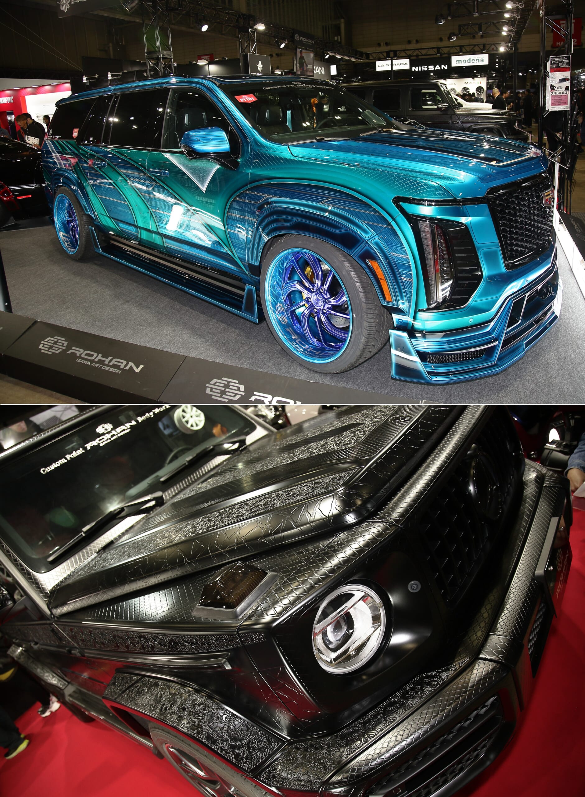 ROHAN IZAWA ART DESIGN社はペインターの井澤孝彦が率いる職人集団。3Dメタルフィニッシュのキャデラック・エスカレードが眩い! さらに奥に見える黒いGクラスはエングレービング(掘り)が施されるなど車をキャンバスに見立てた芸術作品が盛りだくさん。
