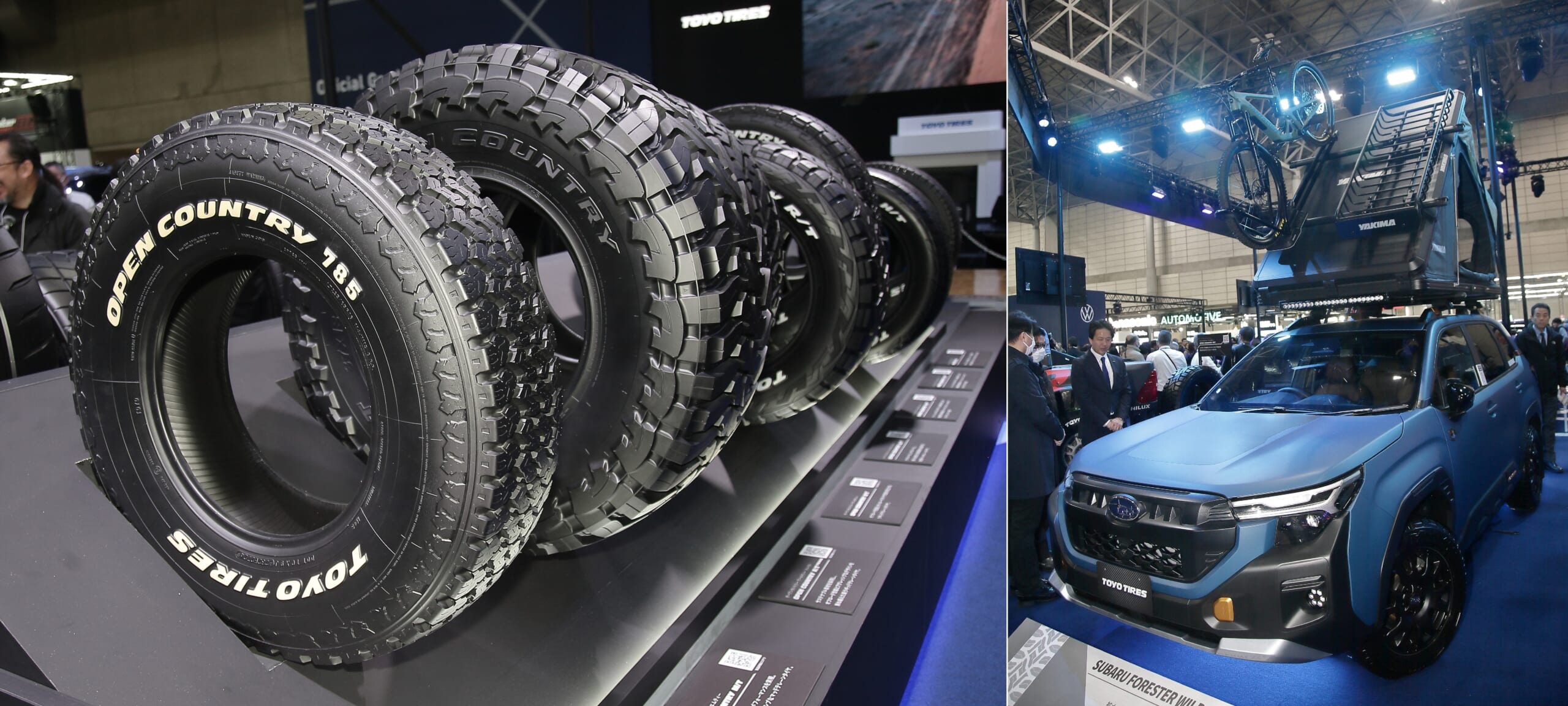 SUVやクロカンで高い装着率を誇る「TOYO TIRES(トーヨータイヤ)」のオープンカントリーがずらり! 実際に装着したスバル・フォレスターやフォード・F-150ラプターなども展示されていた。