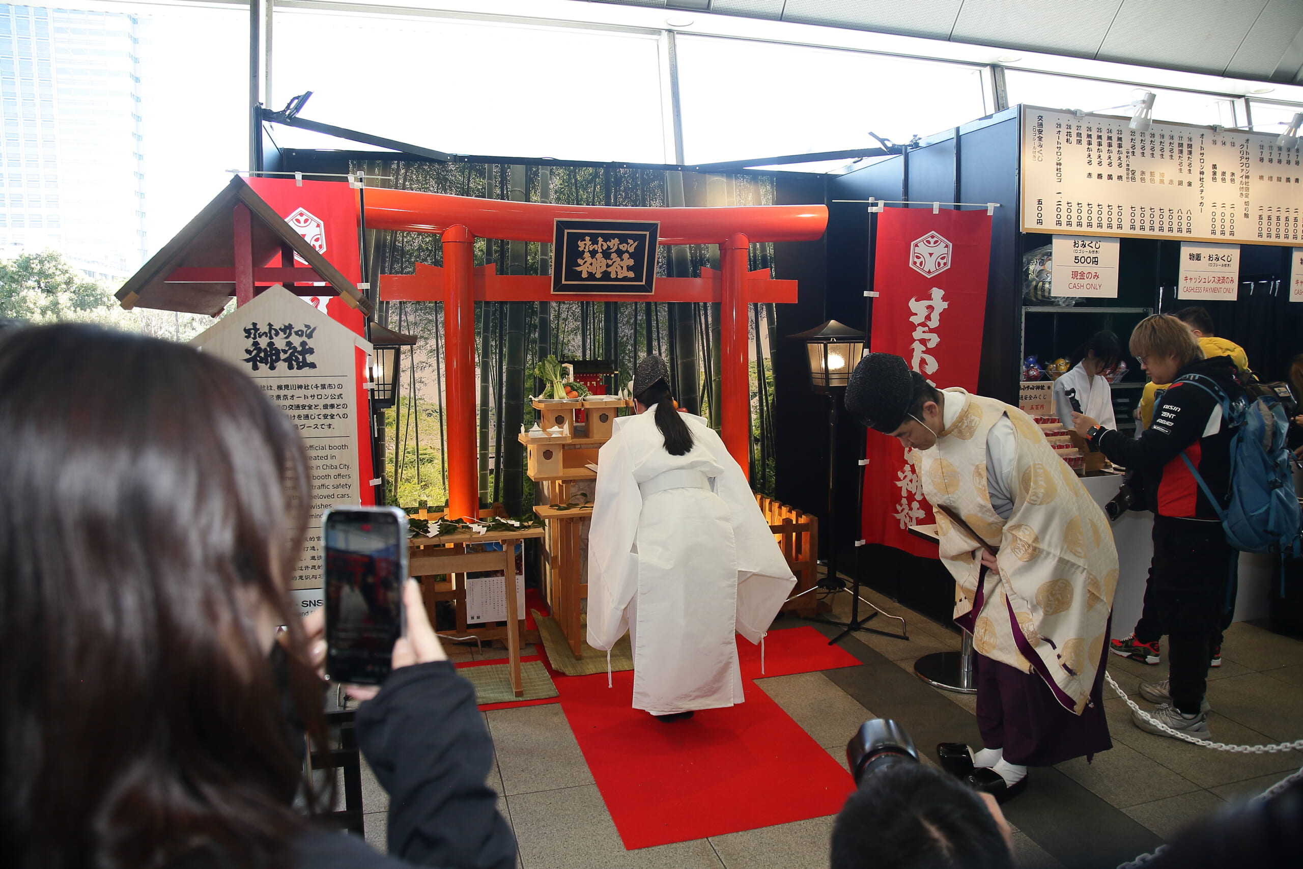 神社(ブース)では交通安全みくじのほか、オリジナルのダルマや絵馬、お守り型の蓄光チャームなども販売しているぞ。