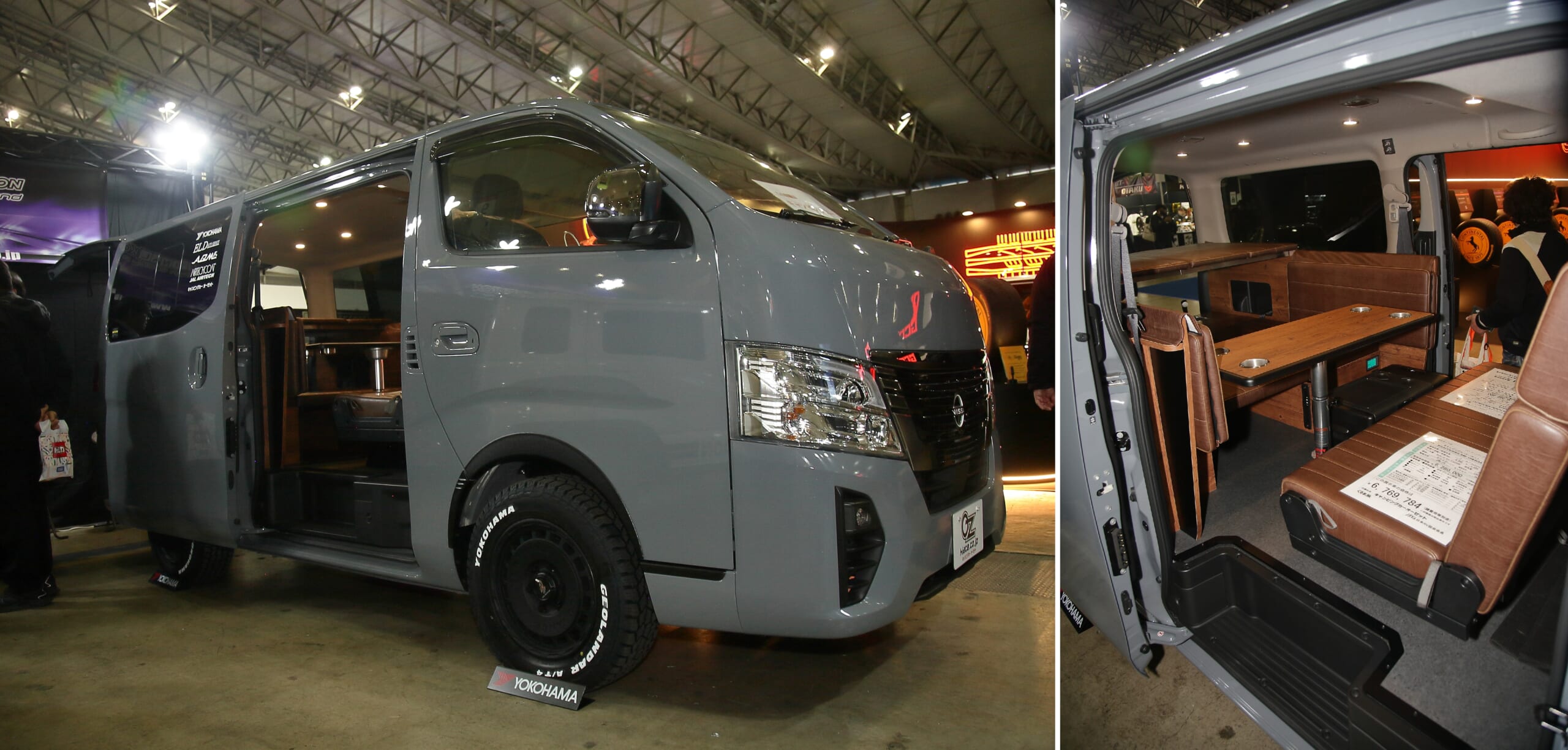 ハイエースのライバル、日産・キャラバンも忘れちゃいけない! こちらはキャンピングカー専門ショップが手掛けた一台で、ブラウン系の内装が落ち着いた雰囲気。