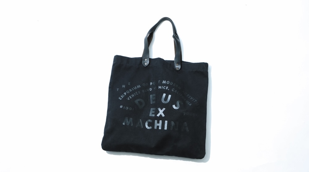 デウス・エクス・マキナのトートバッグはヘルメットがちょうど収まるサイズで旅先など、バイクから少し離れる際に大活躍。