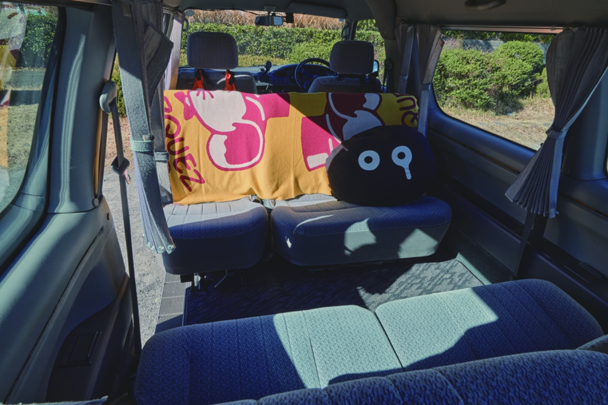 2列目は回転式シートなので3列目と対面にできる。ブランケットや寝袋入りクッションも常備。「このサイズで8人乗りだし、対面シートにするとリビング状態になります」。