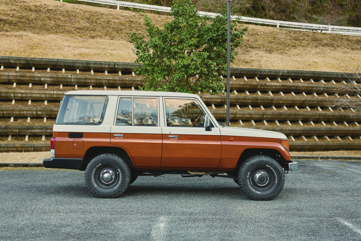 外装はオフホワイトとブラウンの2トーンにオールペン。車高を2インチアップし、サイドステップを外したナローカスタムを施している。「ちょっとレトロなカラーリングは、ランクルの55系をイメージしました」。