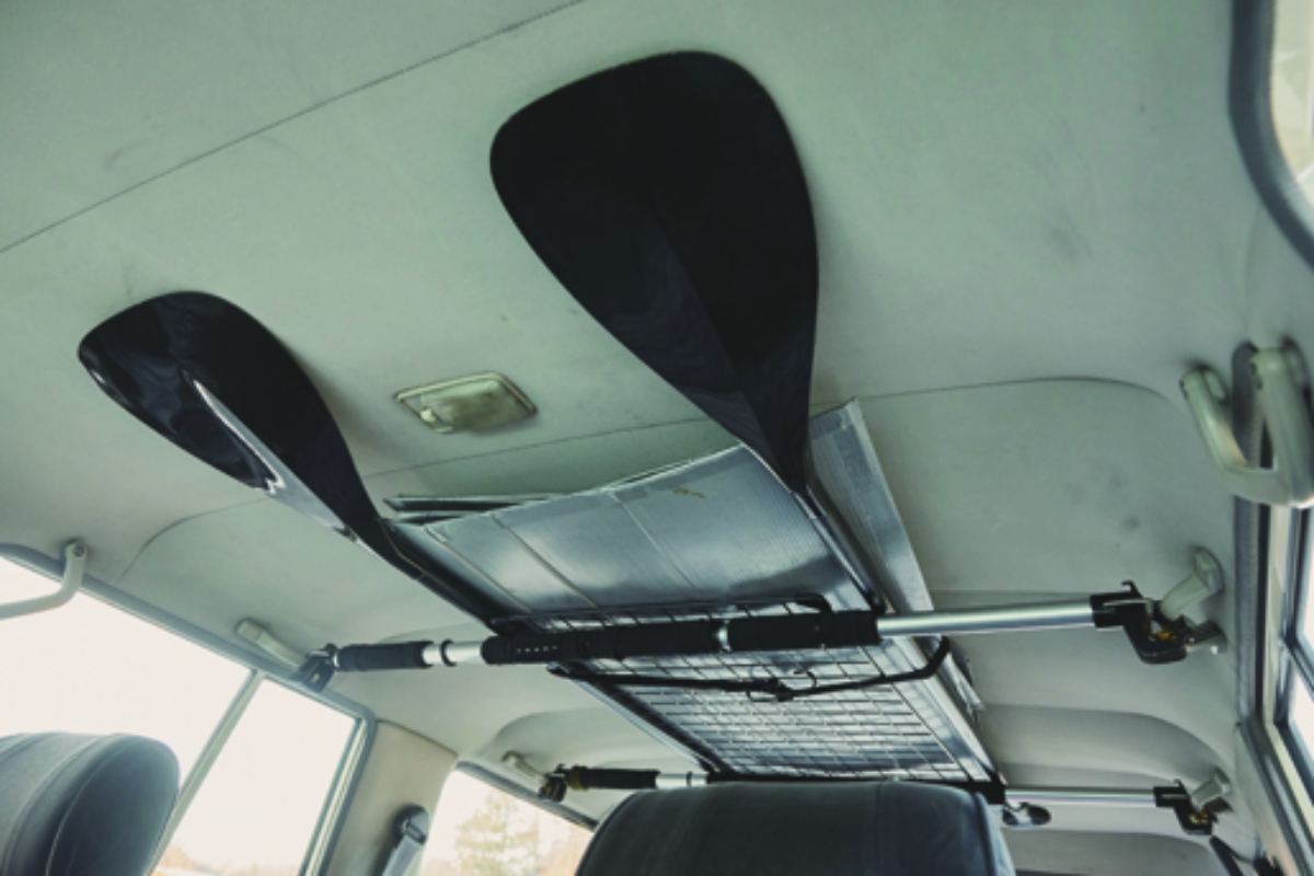 車内の天井にはパイプを通して網棚を設置。SUPのオールや、目隠し用のプラダンをスマートに収納。