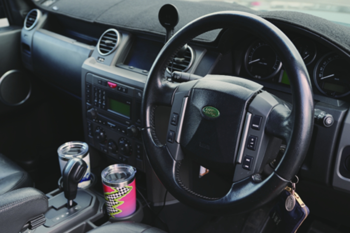 高級感のあるレザーハンドルも、ほどよく艶が出ている。車内では海外で購入してきたイエティのタンブラーを夫婦で愛用。