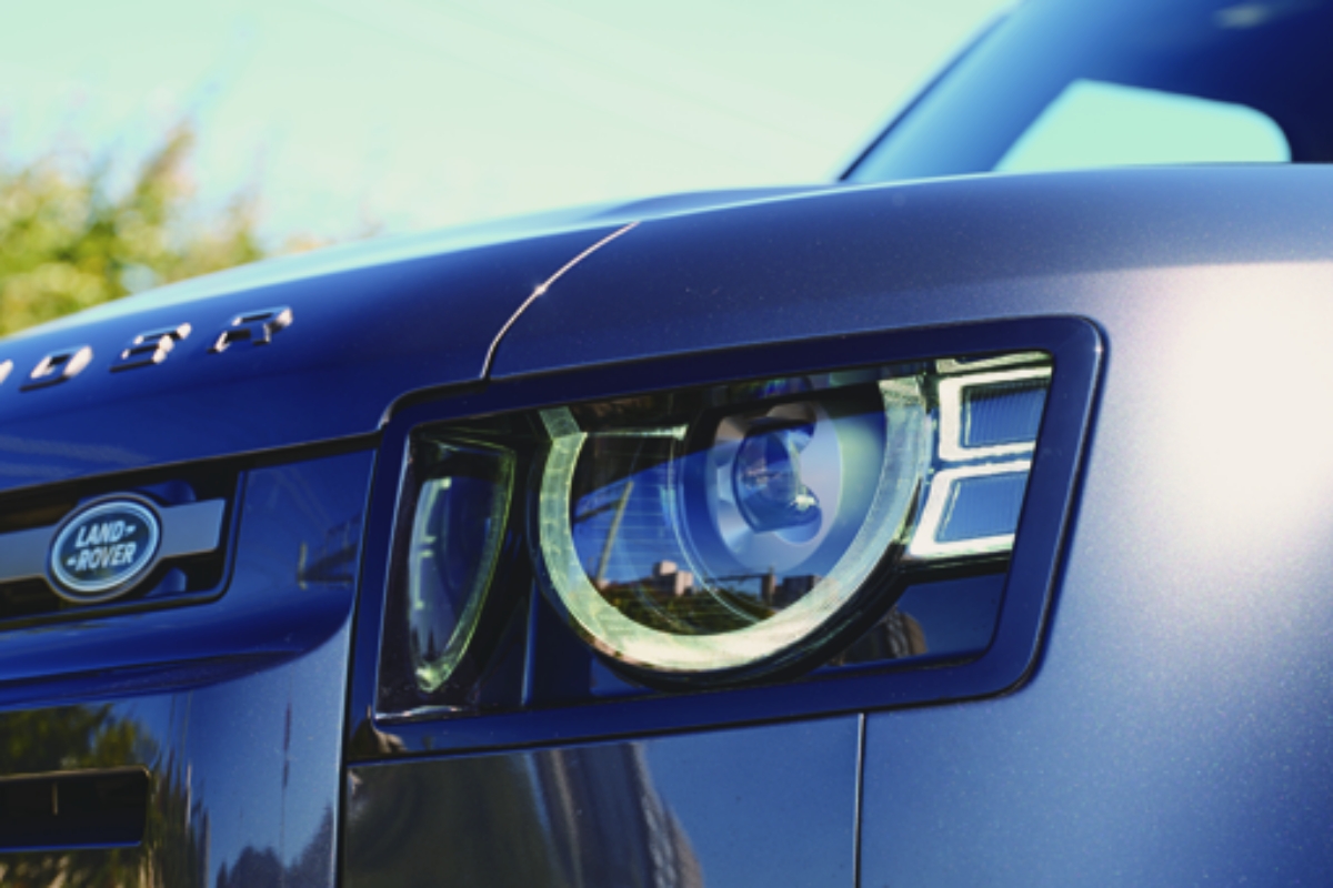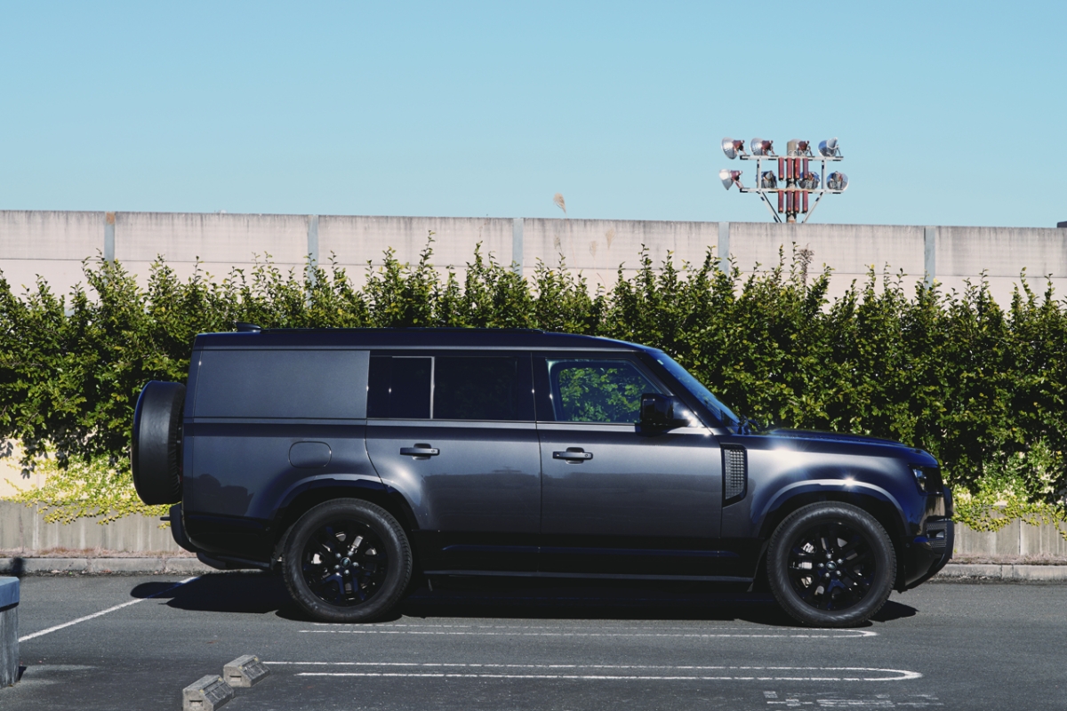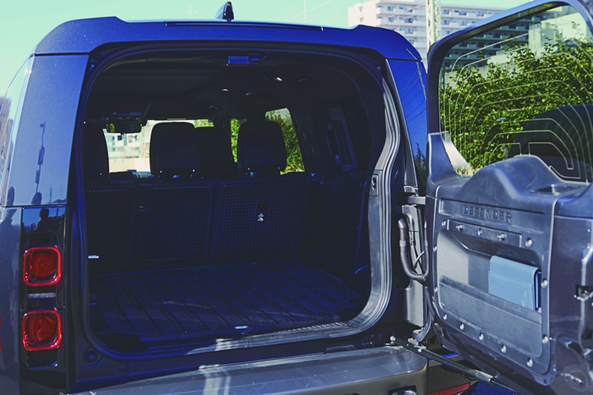 シリーズ最高レベルのスペースを実現するディフェンダー130。全長約5.3mあり、ハイエースより長い。こちらは2列シート5人乗り仕様のアウトバウンド。「このグレードが出たタイミングで、速攻予約しました」。